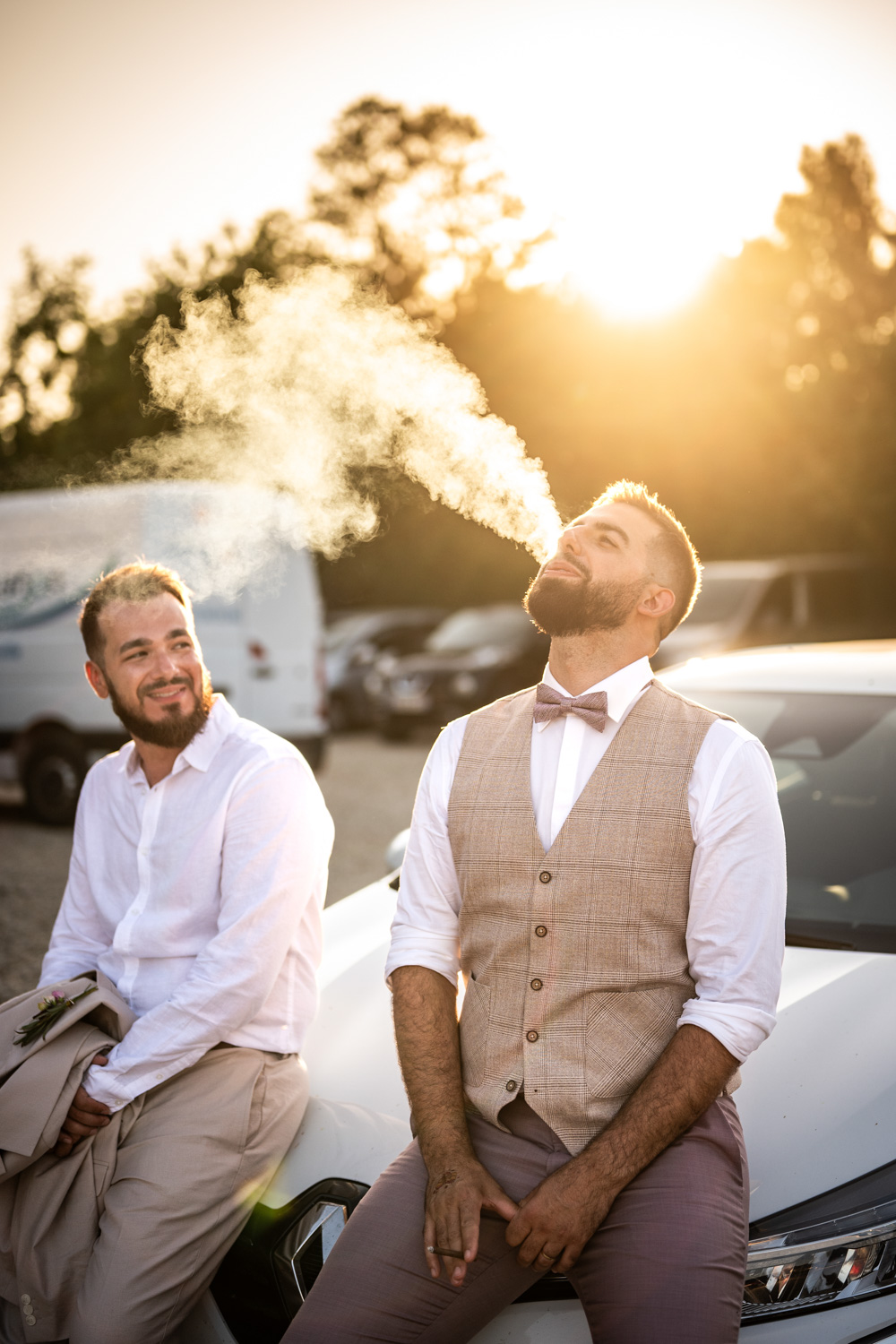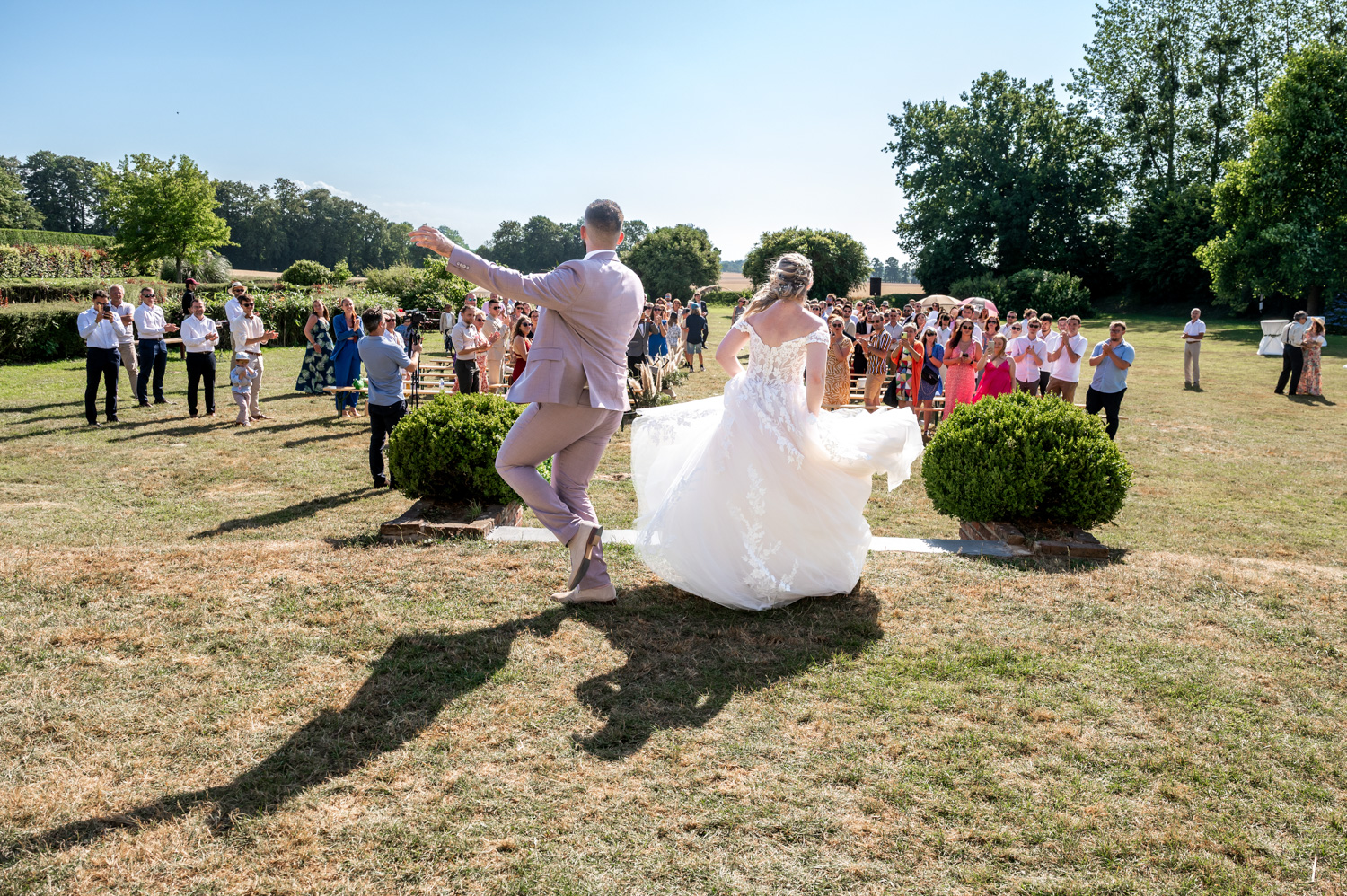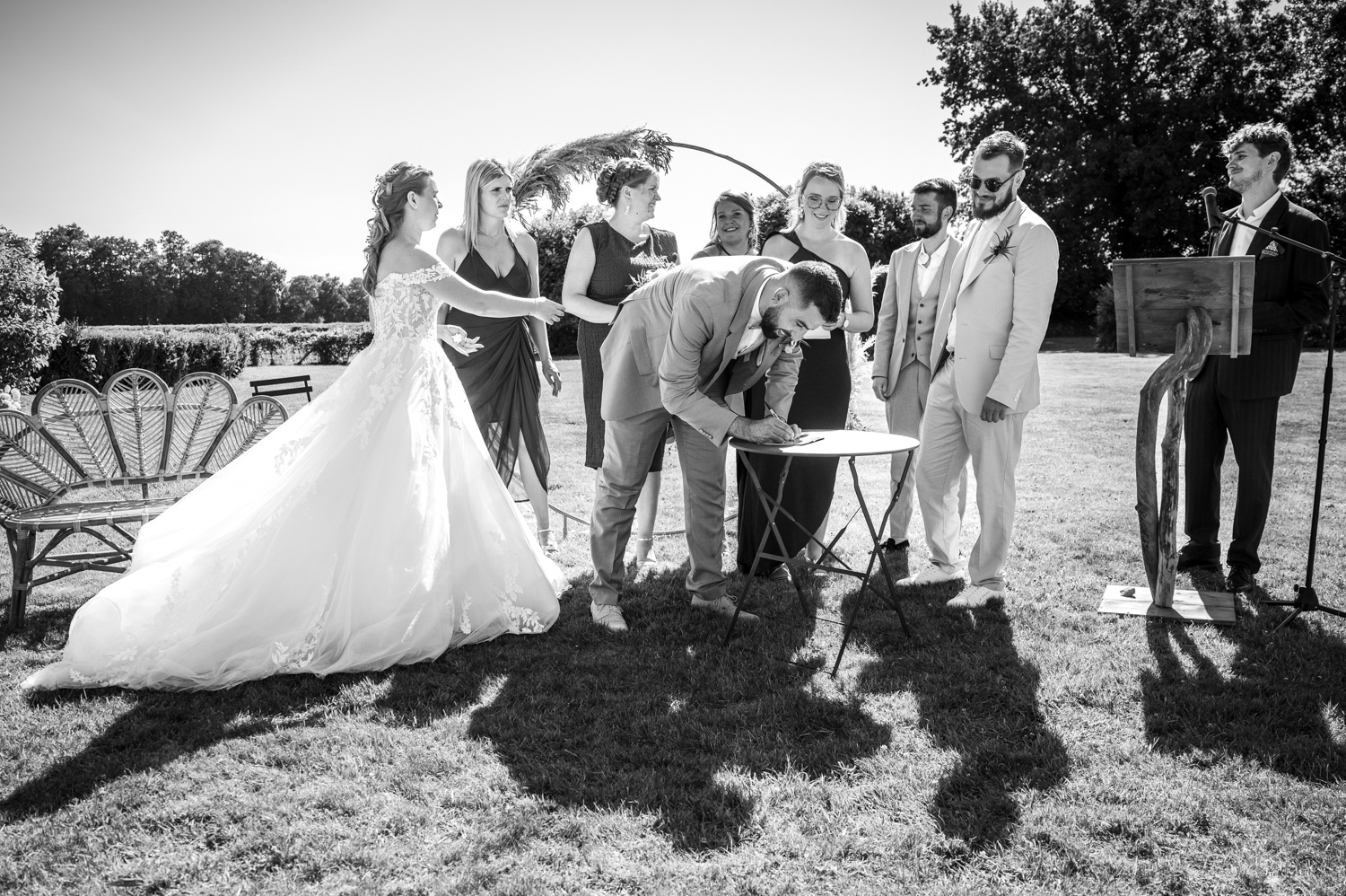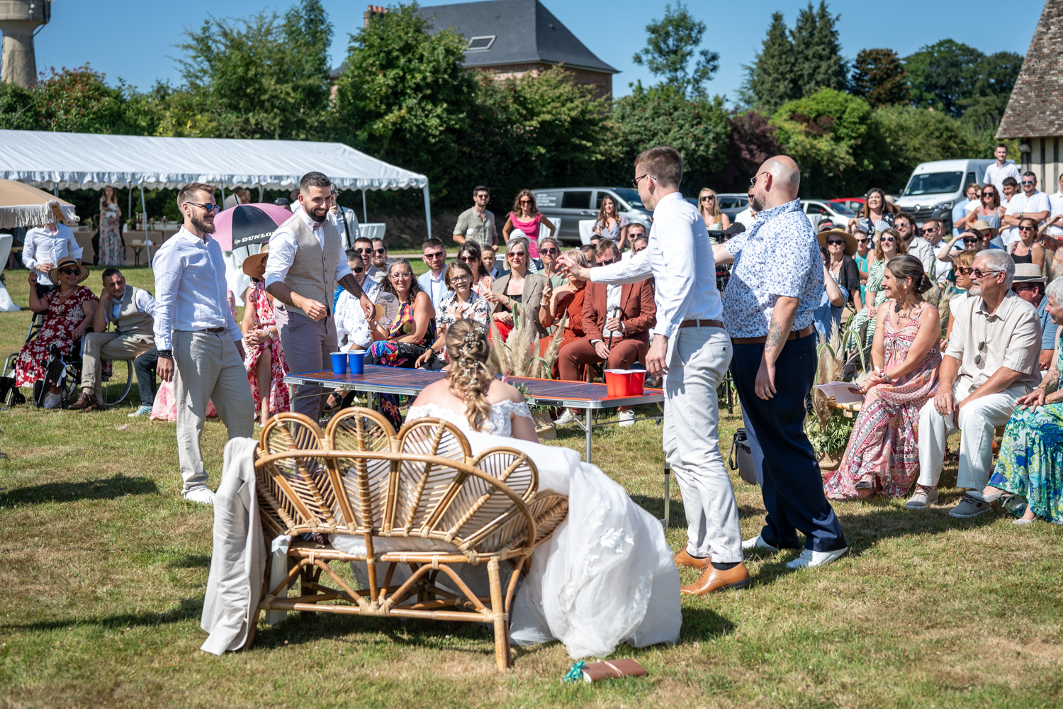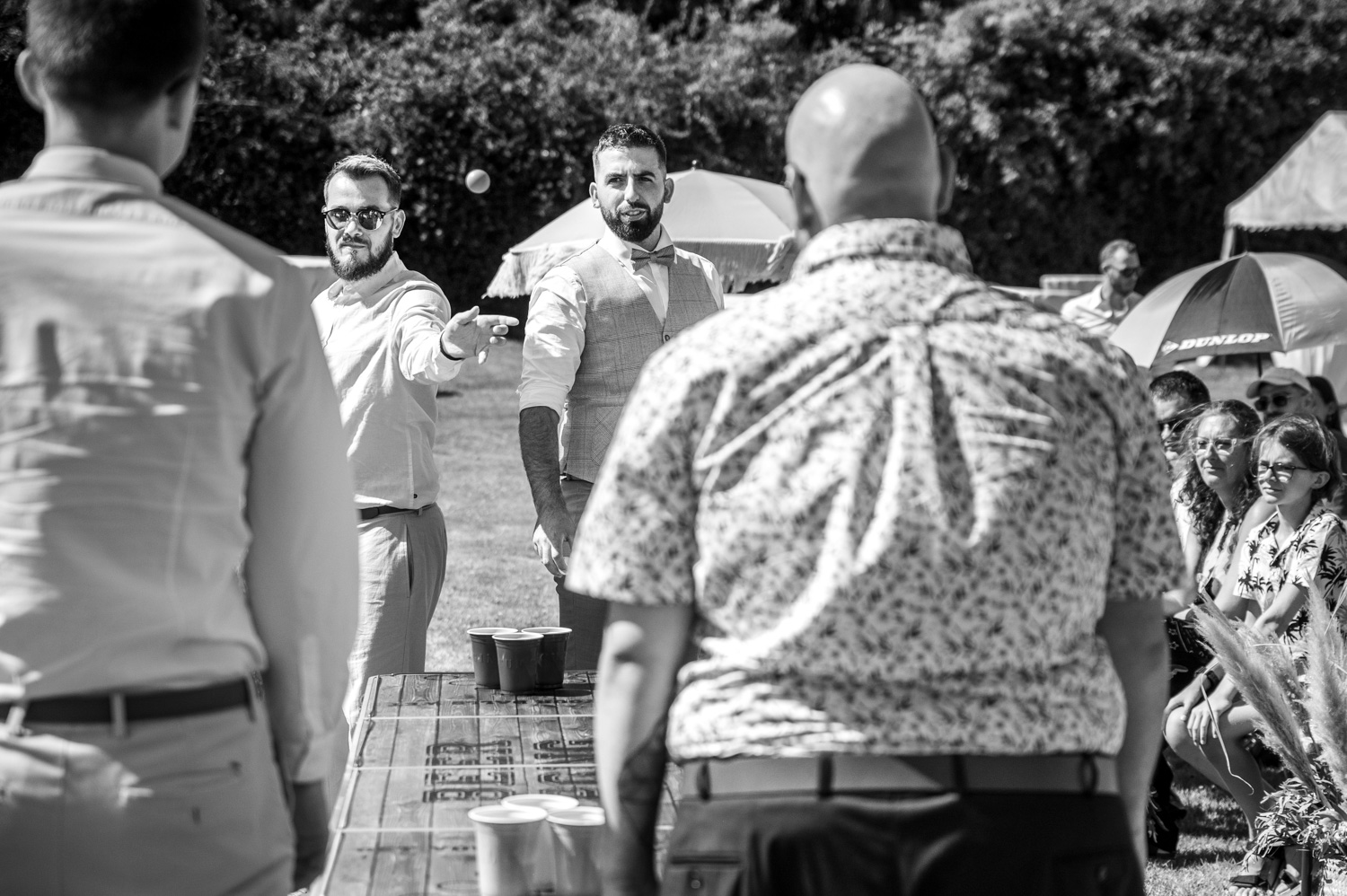 Nous avons immortalisé leur journée des préparatifs dans un gîte loué pour l’occasion, jusqu’à leur ouverture de bal, sans oublier évidemment leur belle cérémonie laïque réalisé sous un soleil de plomb mais avec une partie de beer pong et un magistral chifoumi entre les mariés pour décider qui lira ses voeux à l’autre en premier !