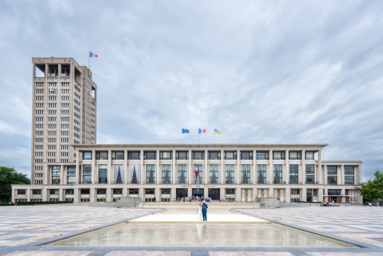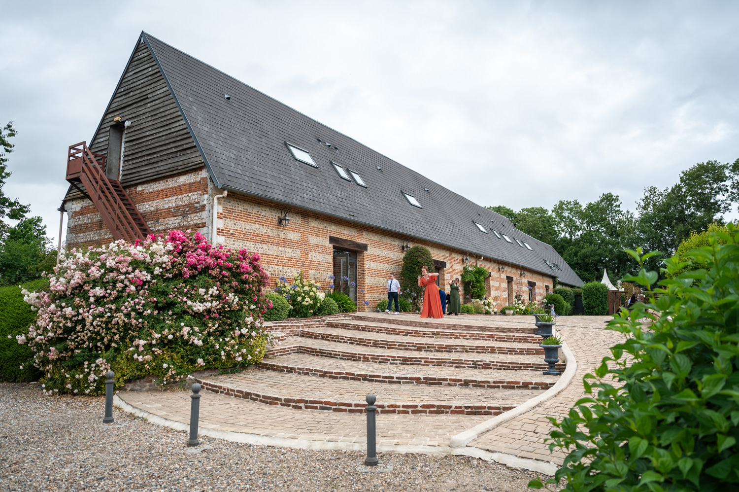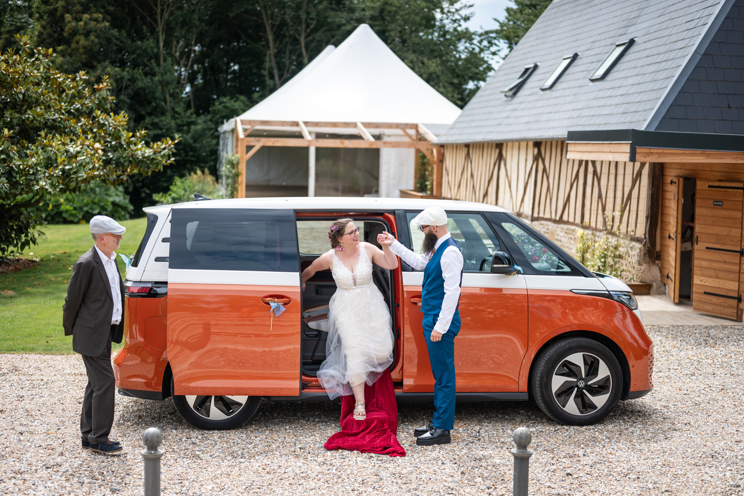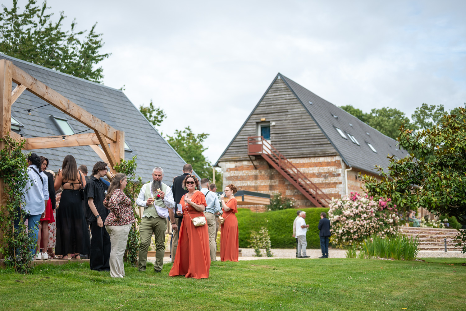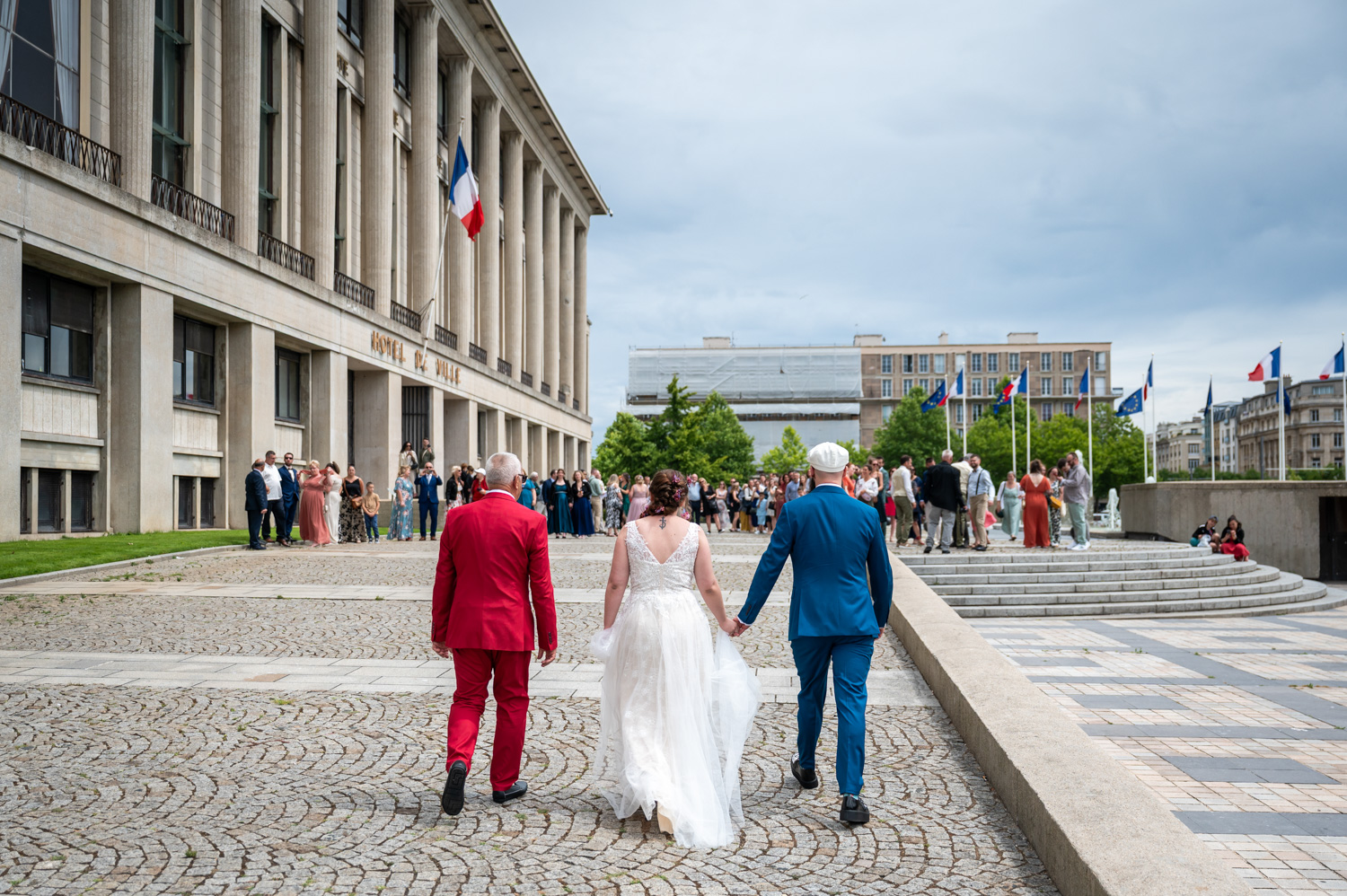 Le jour de leur mariage, ils se sont chacun préparés avec leurs témoins dans une ambiance chill et en musique évidemment ! Puis direction l’hôtel du ville du Havre pour se marier ! La suite de la journée s’est ensuite déroulée intégralement à la Ferme de Drumare pour y célébrer une cérémonie laïque touchante, une cocktail sous la pluie et un repas rythmé à grands coups de riffs de guitare saturés.