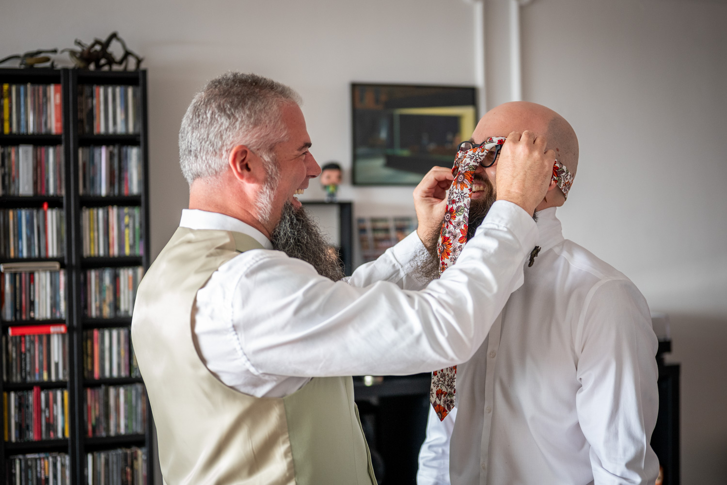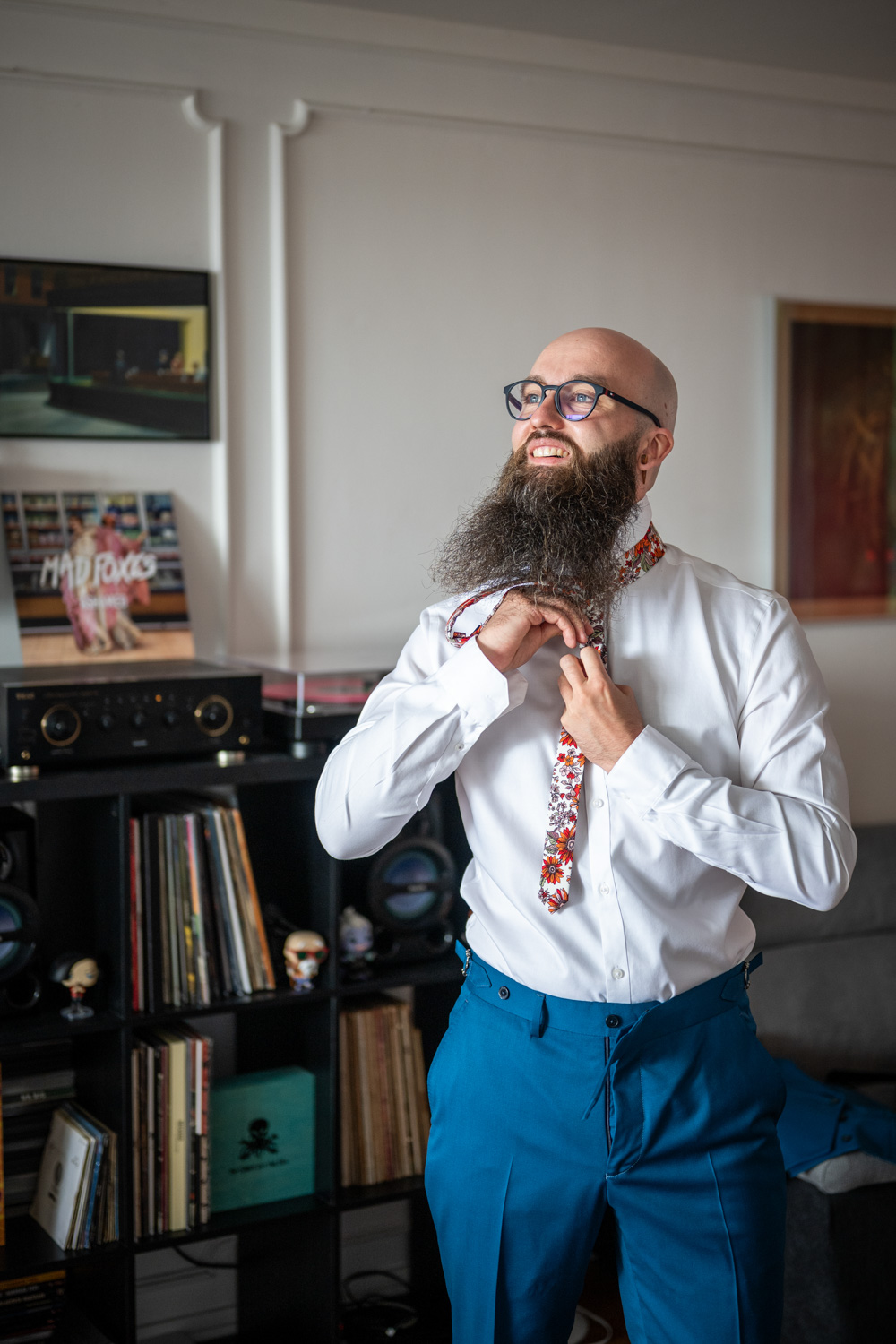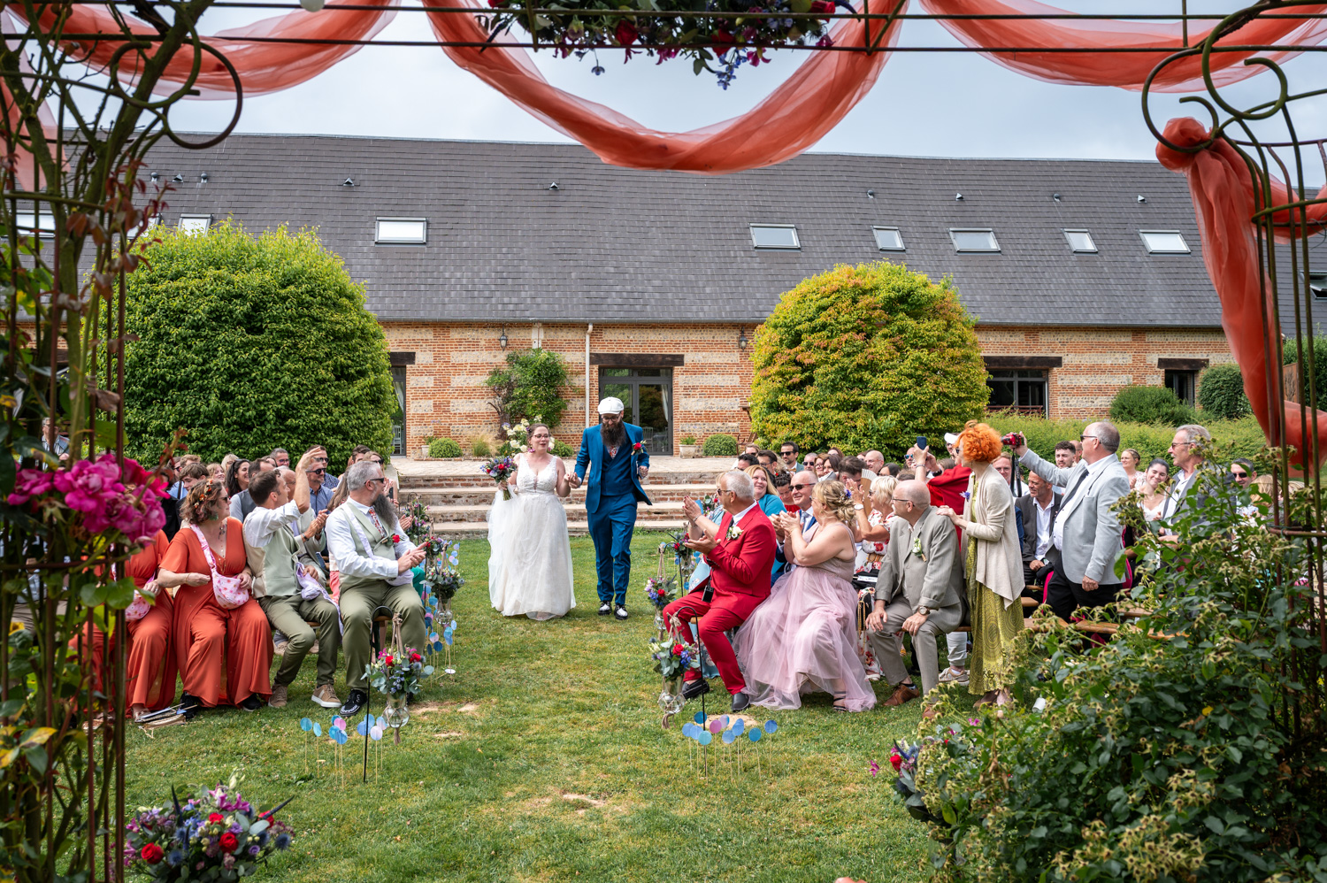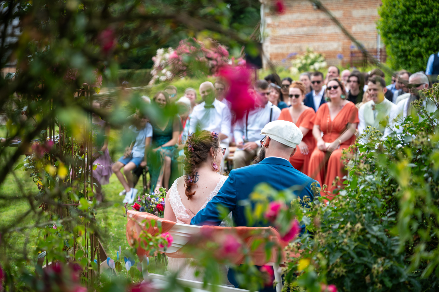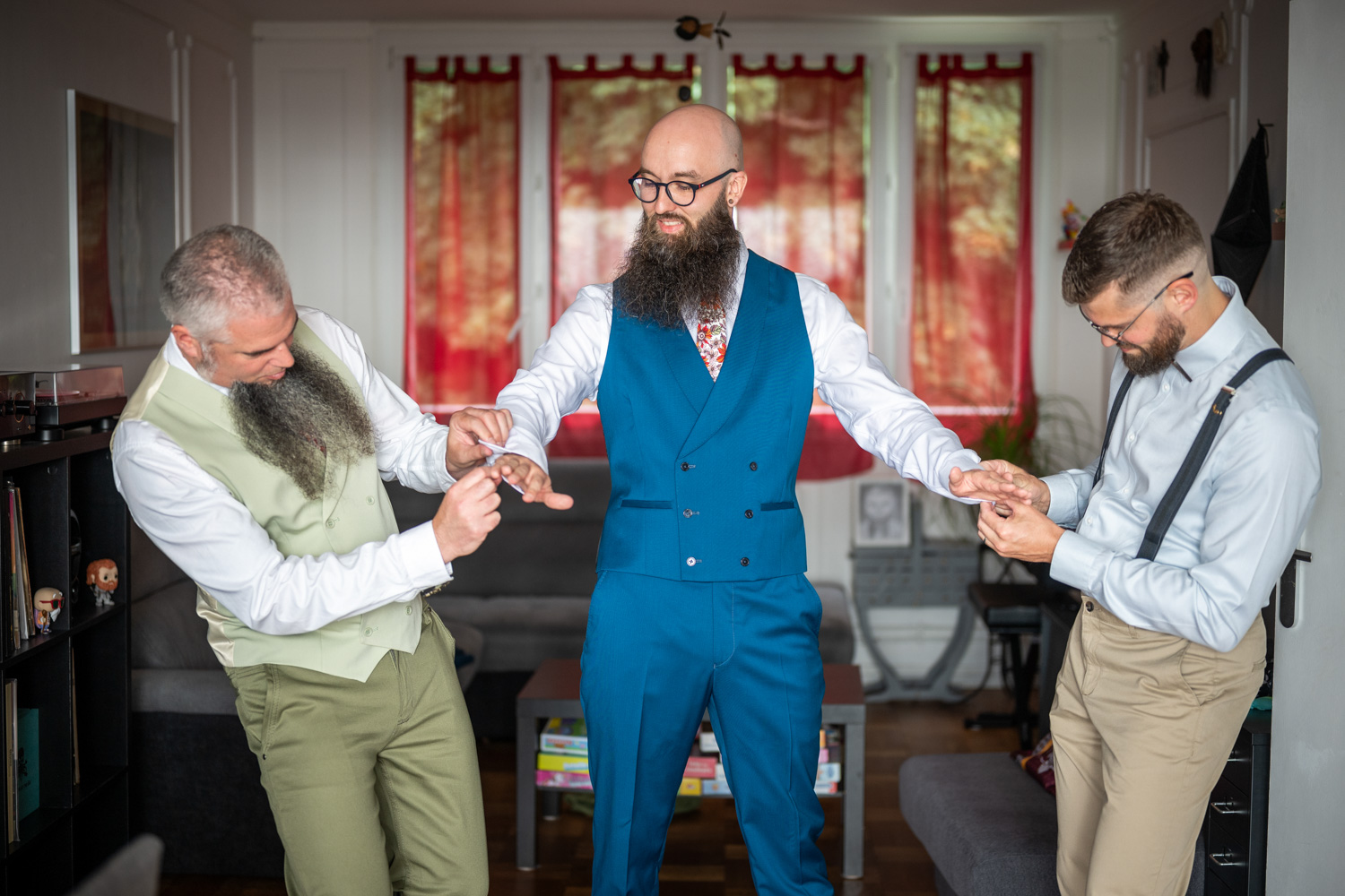 Le jour de leur mariage, ils se sont chacun préparés avec leurs témoins dans une ambiance chill et en musique évidemment ! Puis direction l’hôtel du ville du Havre pour se marier ! La suite de la journée s’est ensuite déroulée intégralement à la Ferme de Drumare pour y célébrer une cérémonie laïque touchante, une cocktail sous la pluie et un repas rythmé à grands coups de riffs de guitare saturés.