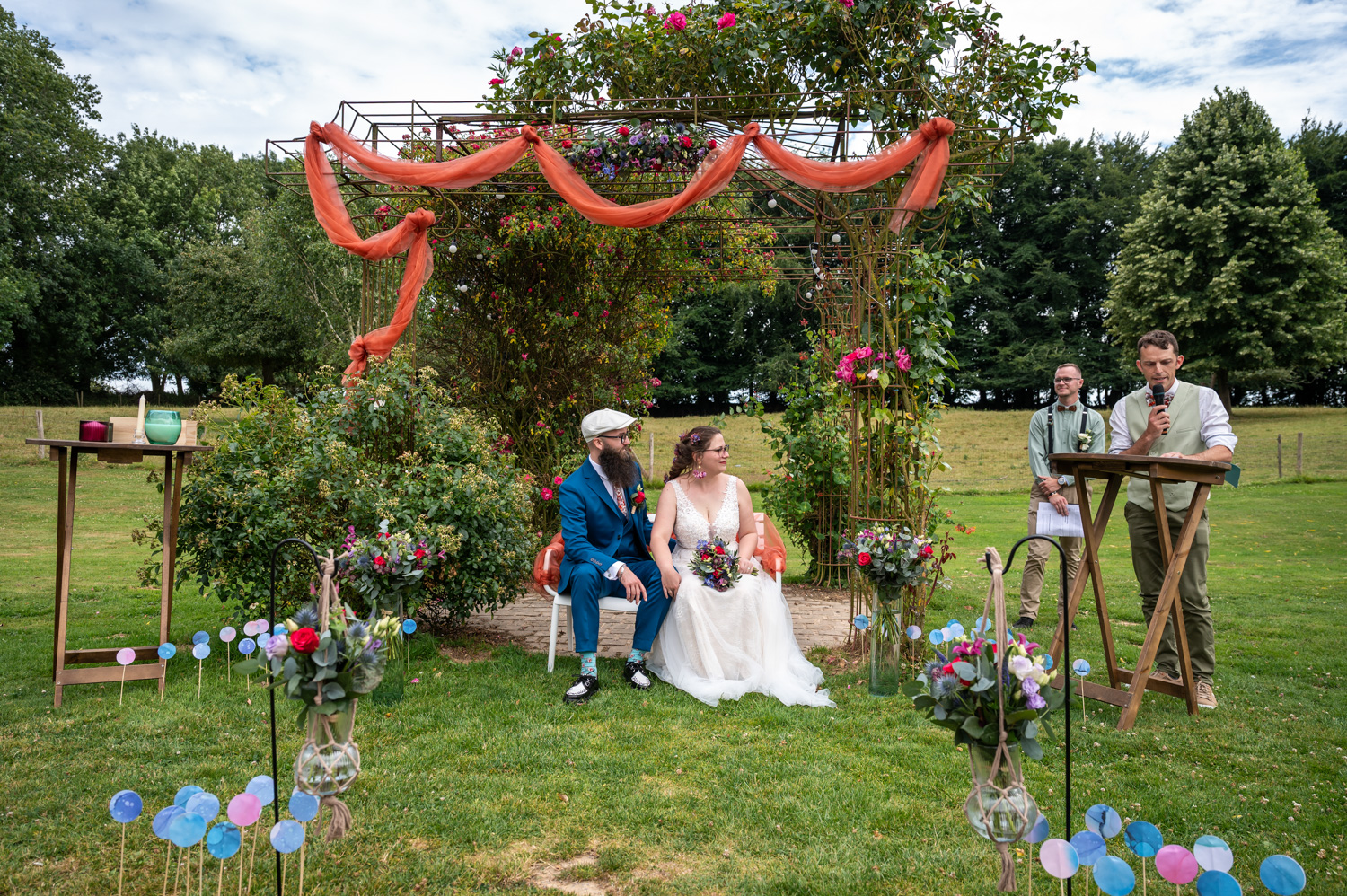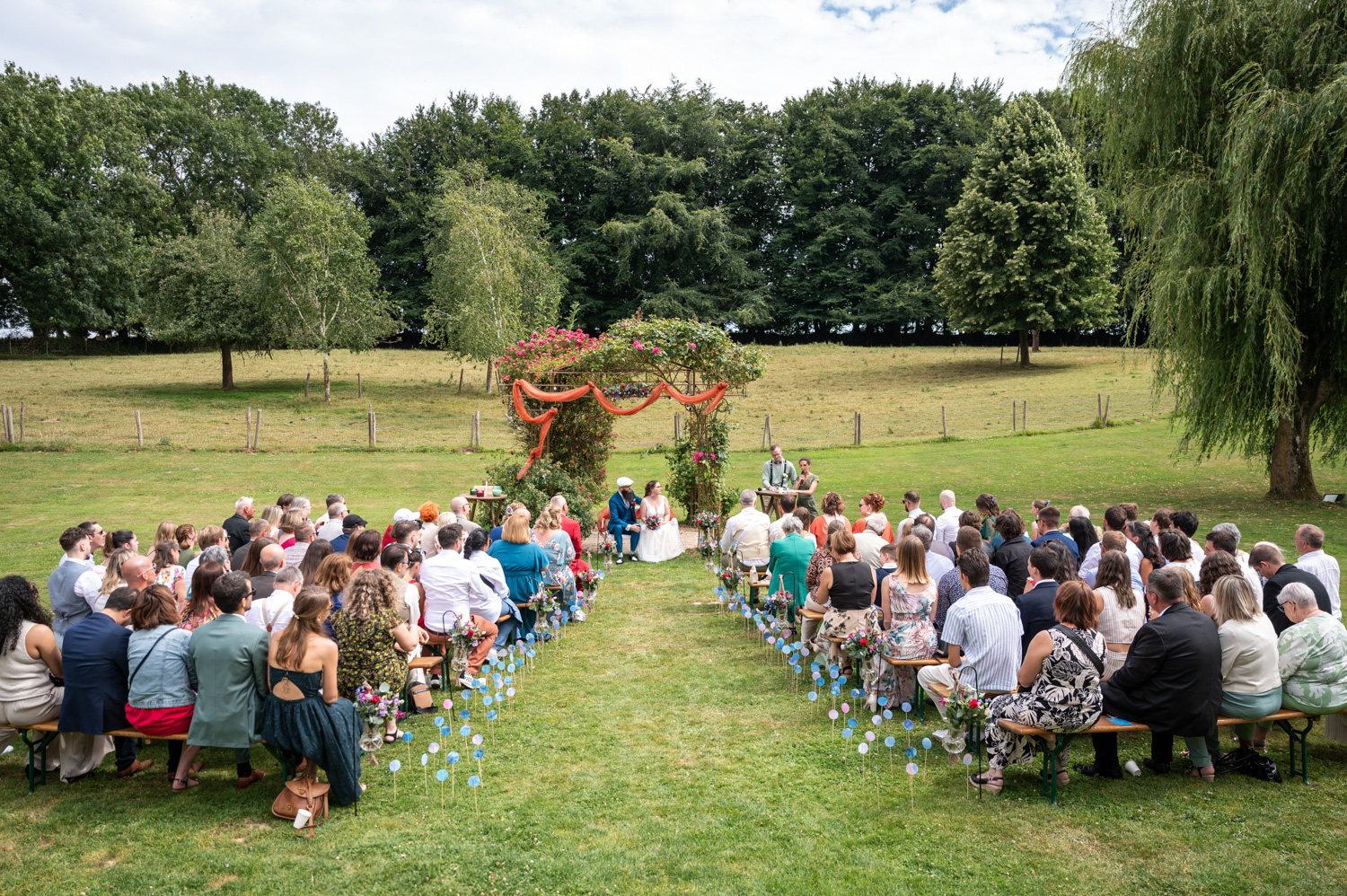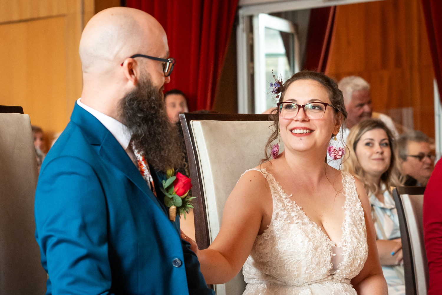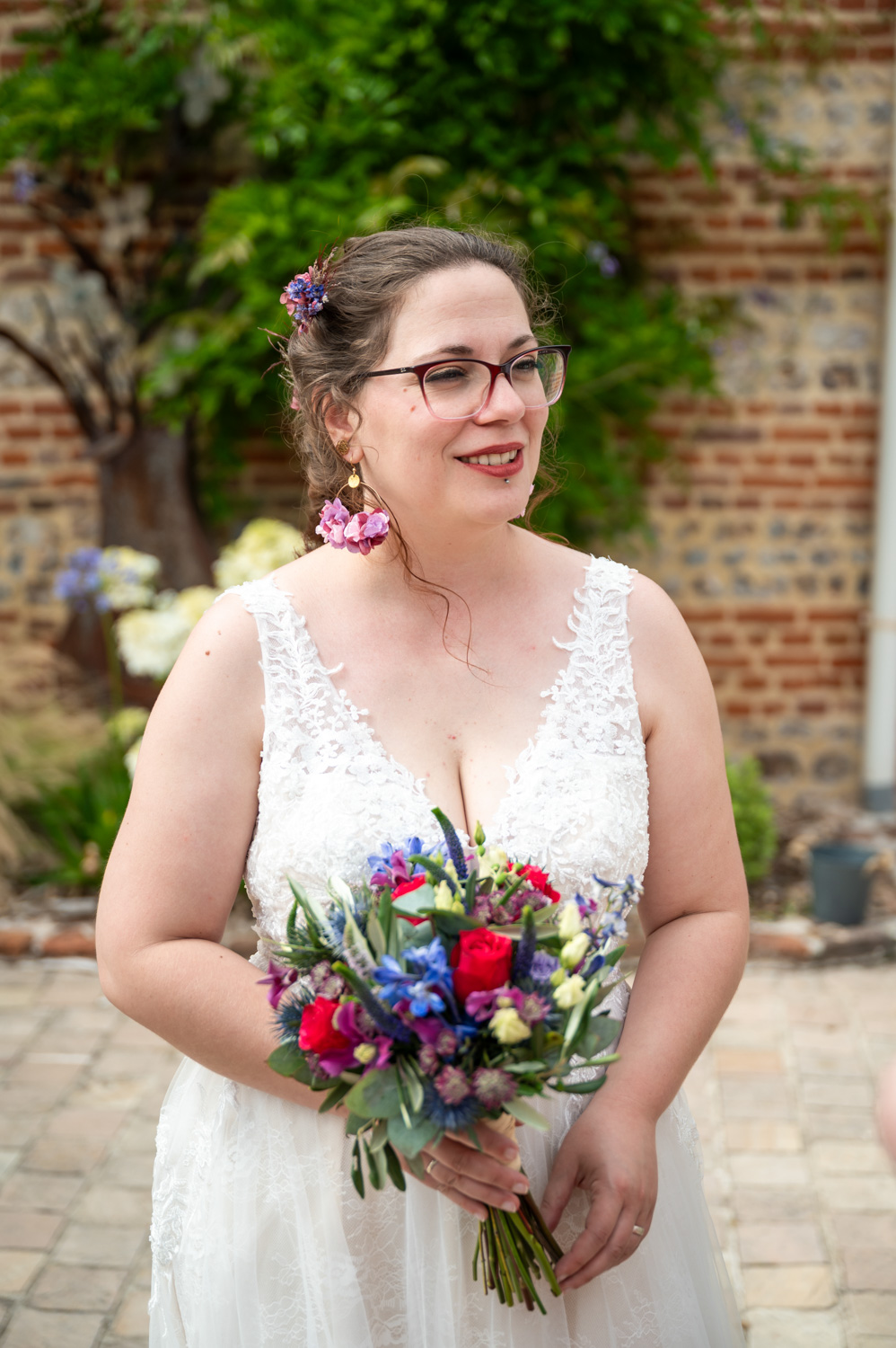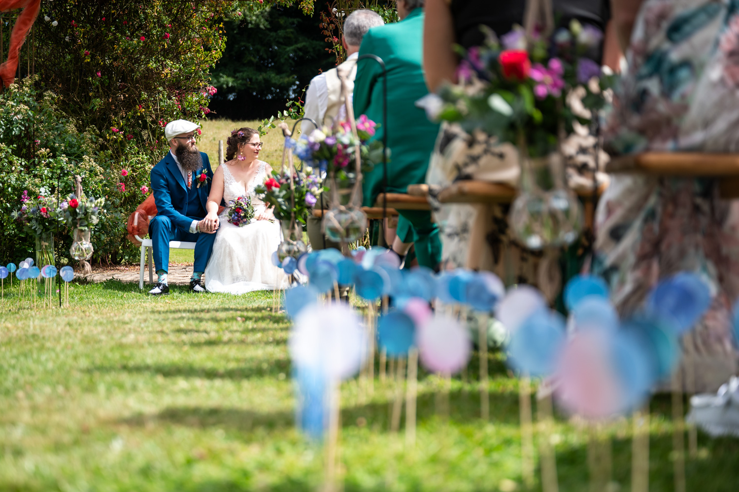 Le jour de leur mariage, ils se sont chacun préparés avec leurs témoins dans une ambiance chill et en musique évidemment ! Puis direction l’hôtel du ville du Havre pour se marier ! La suite de la journée s’est ensuite déroulée intégralement à la Ferme de Drumare pour y célébrer une cérémonie laïque touchante, une cocktail sous la pluie et un repas rythmé à grands coups de riffs de guitare saturés.