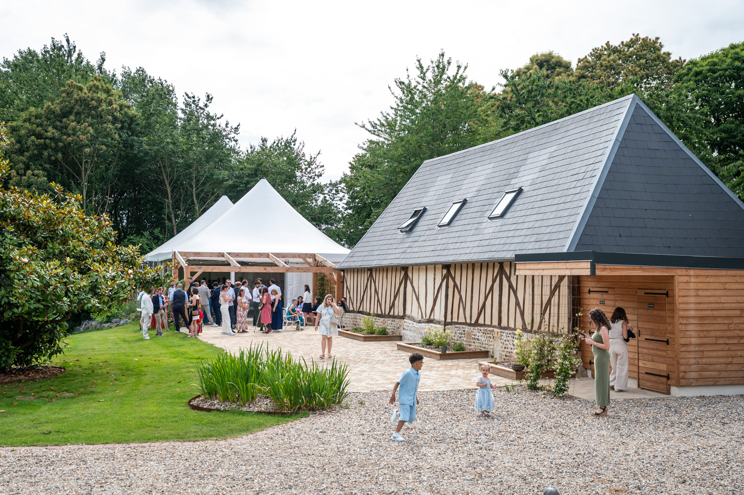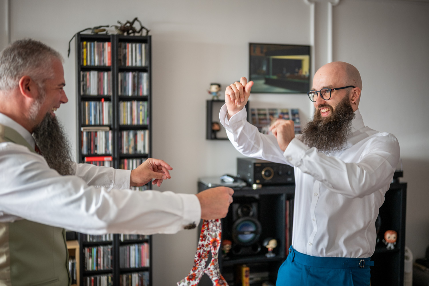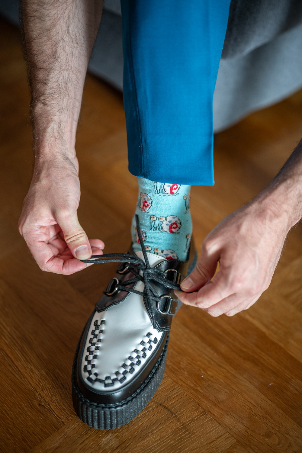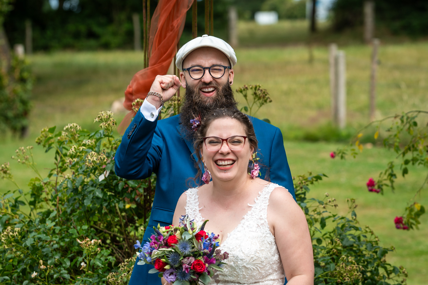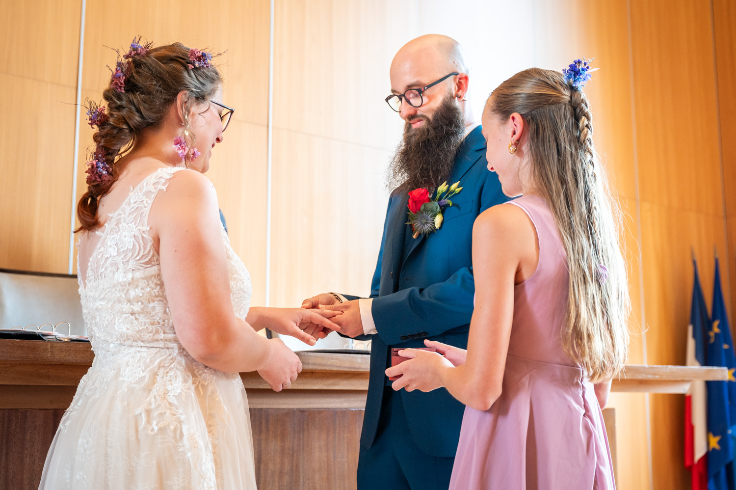 Le jour de leur mariage, ils se sont chacun préparés avec leurs témoins dans une ambiance chill et en musique évidemment ! Puis direction l’hôtel du ville du Havre pour se marier ! La suite de la journée s’est ensuite déroulée intégralement à la Ferme de Drumare pour y célébrer une cérémonie laïque touchante, une cocktail sous la pluie et un repas rythmé à grands coups de riffs de guitare saturés.