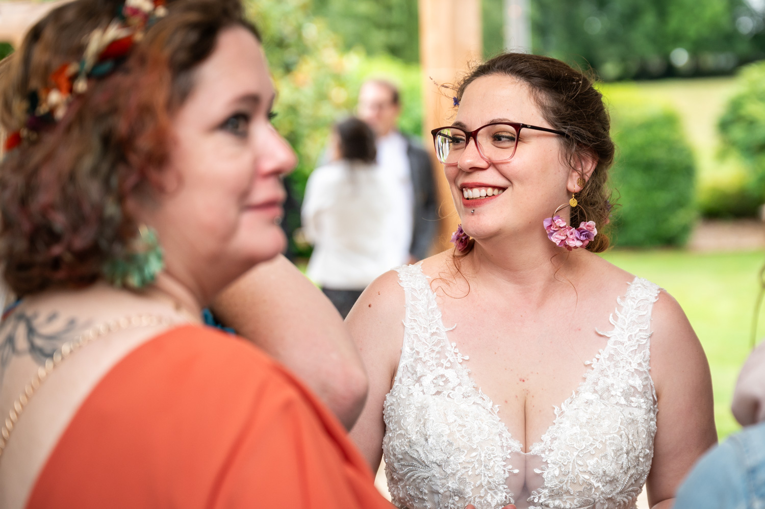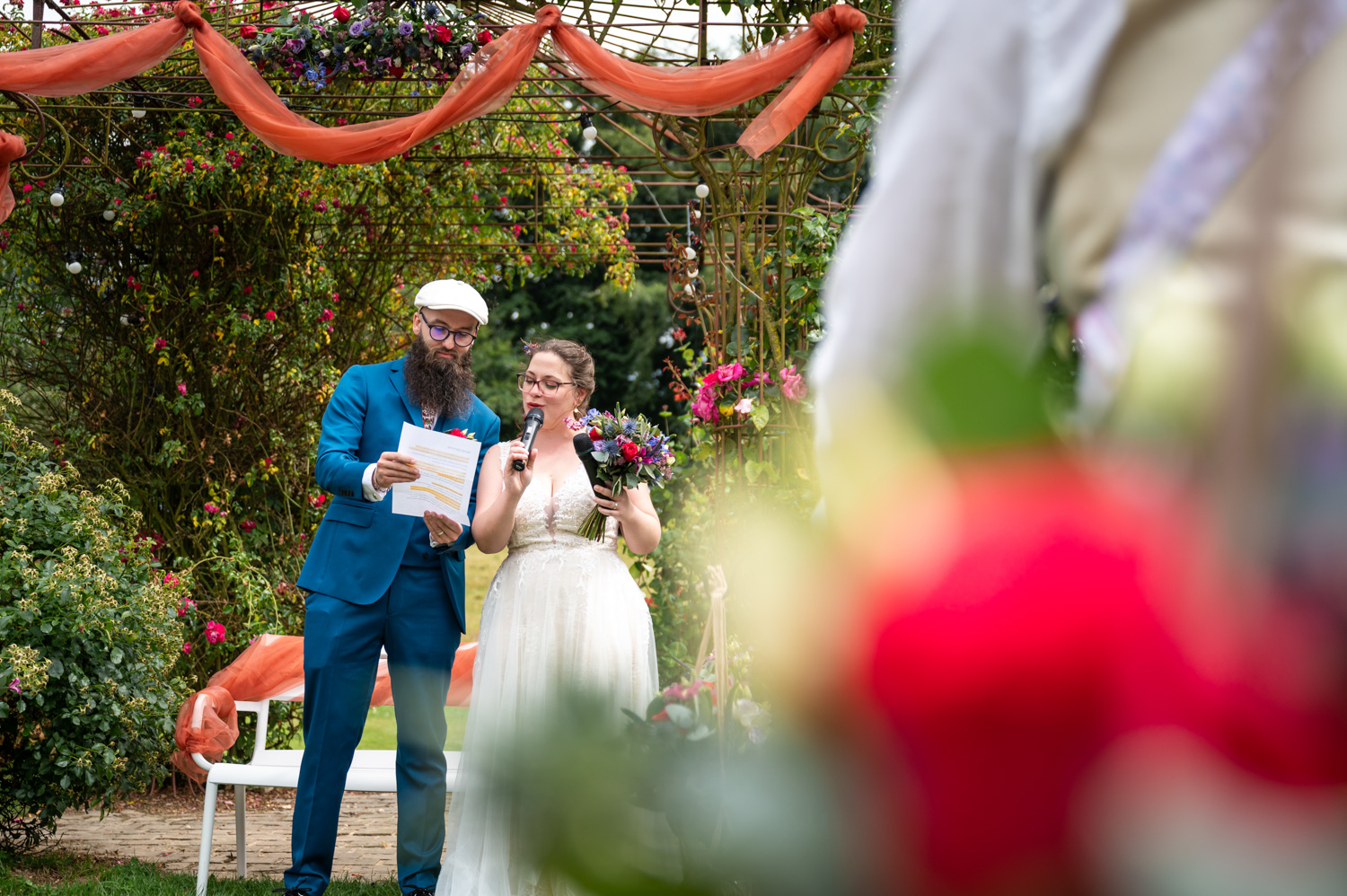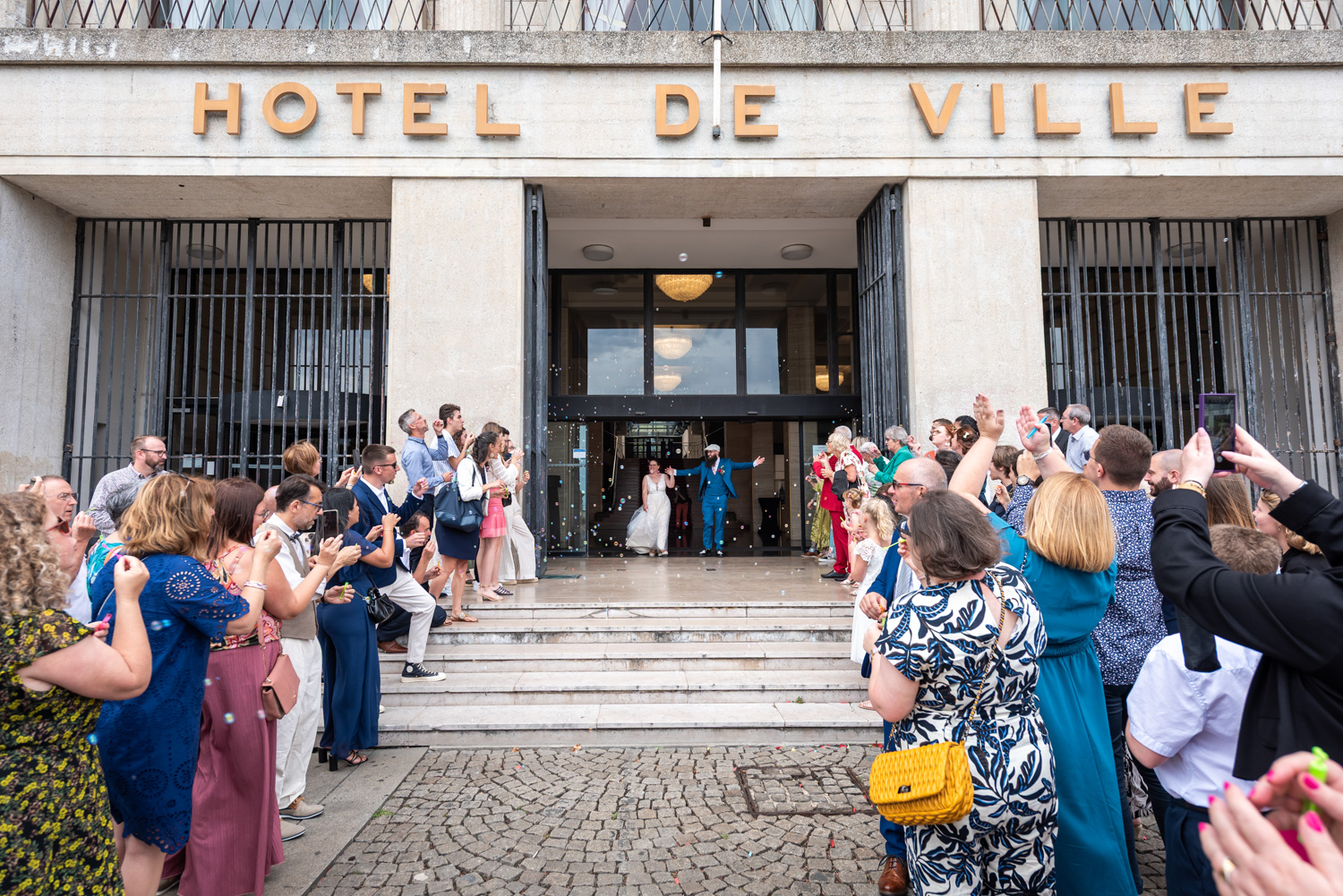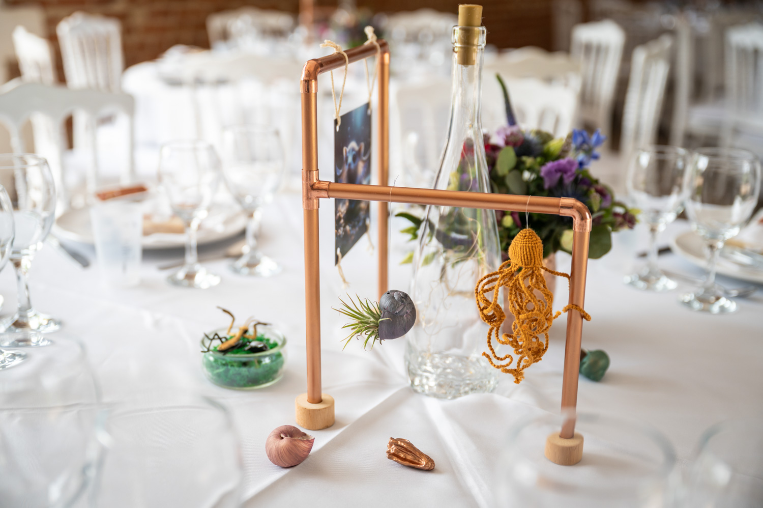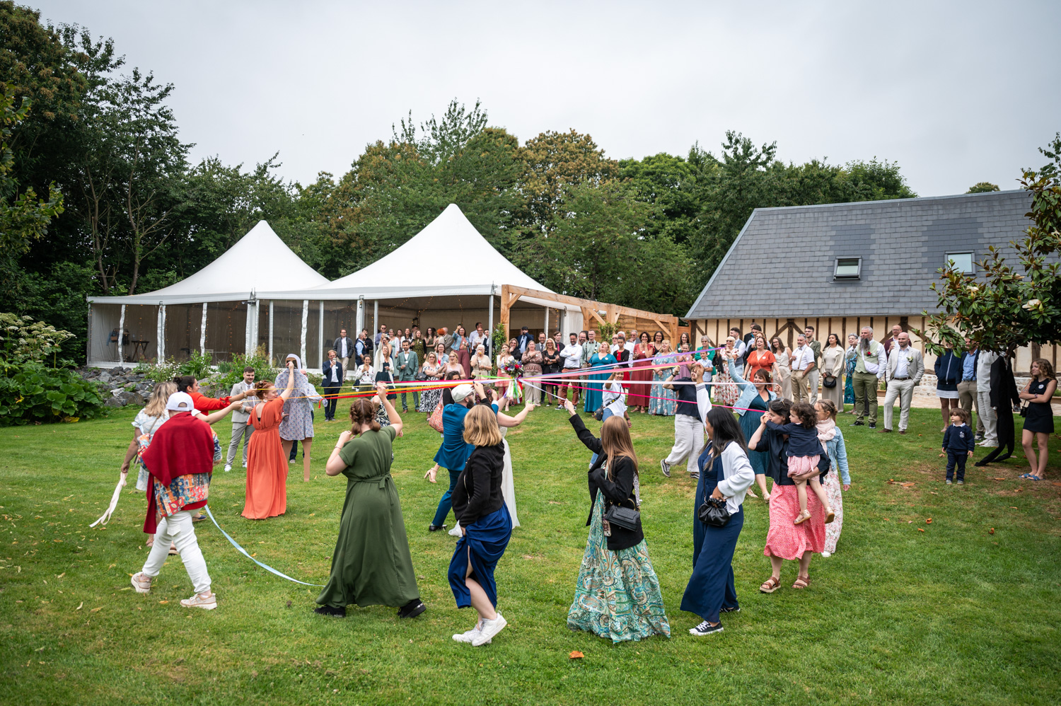 Le jour de leur mariage, ils se sont chacun préparés avec leurs témoins dans une ambiance chill et en musique évidemment ! Puis direction l’hôtel du ville du Havre pour se marier ! La suite de la journée s’est ensuite déroulée intégralement à la Ferme de Drumare pour y célébrer une cérémonie laïque touchante, une cocktail sous la pluie et un repas rythmé à grands coups de riffs de guitare saturés.