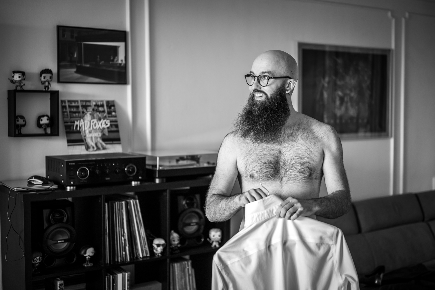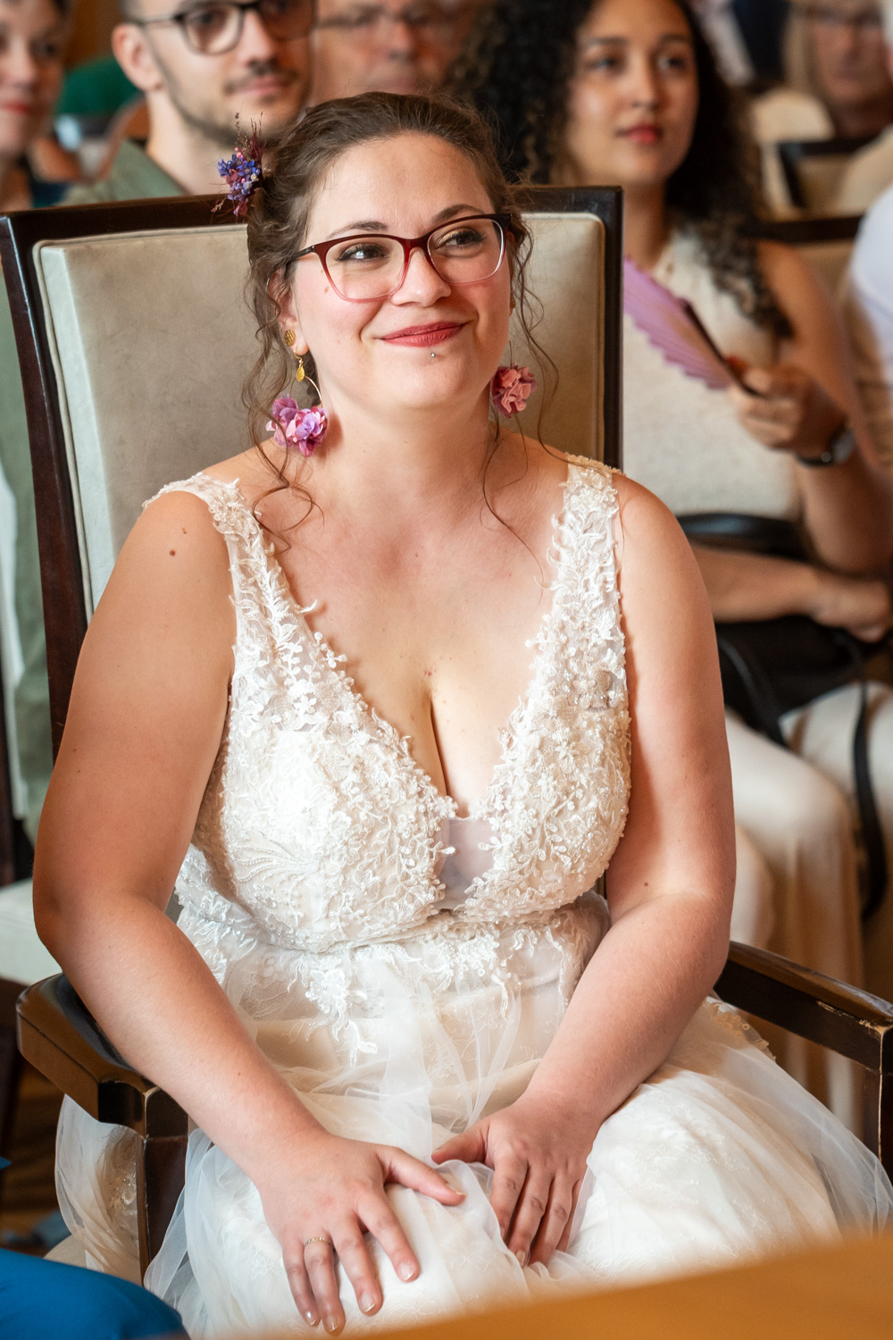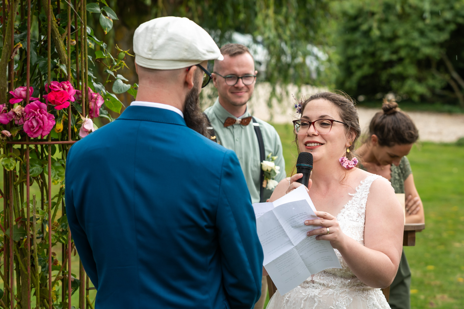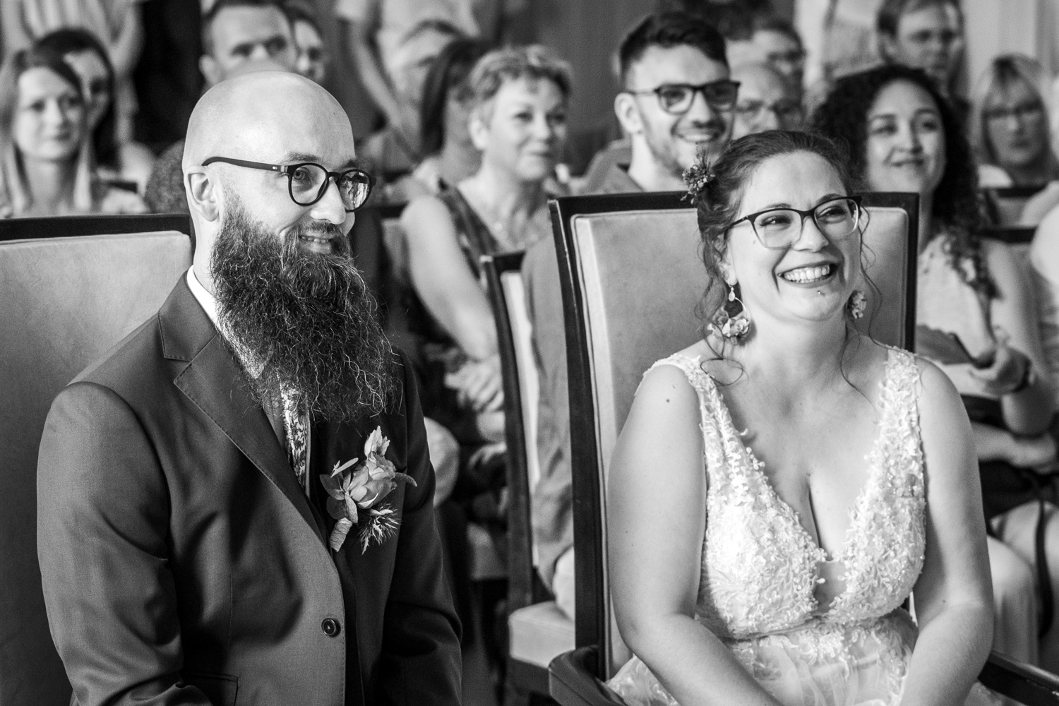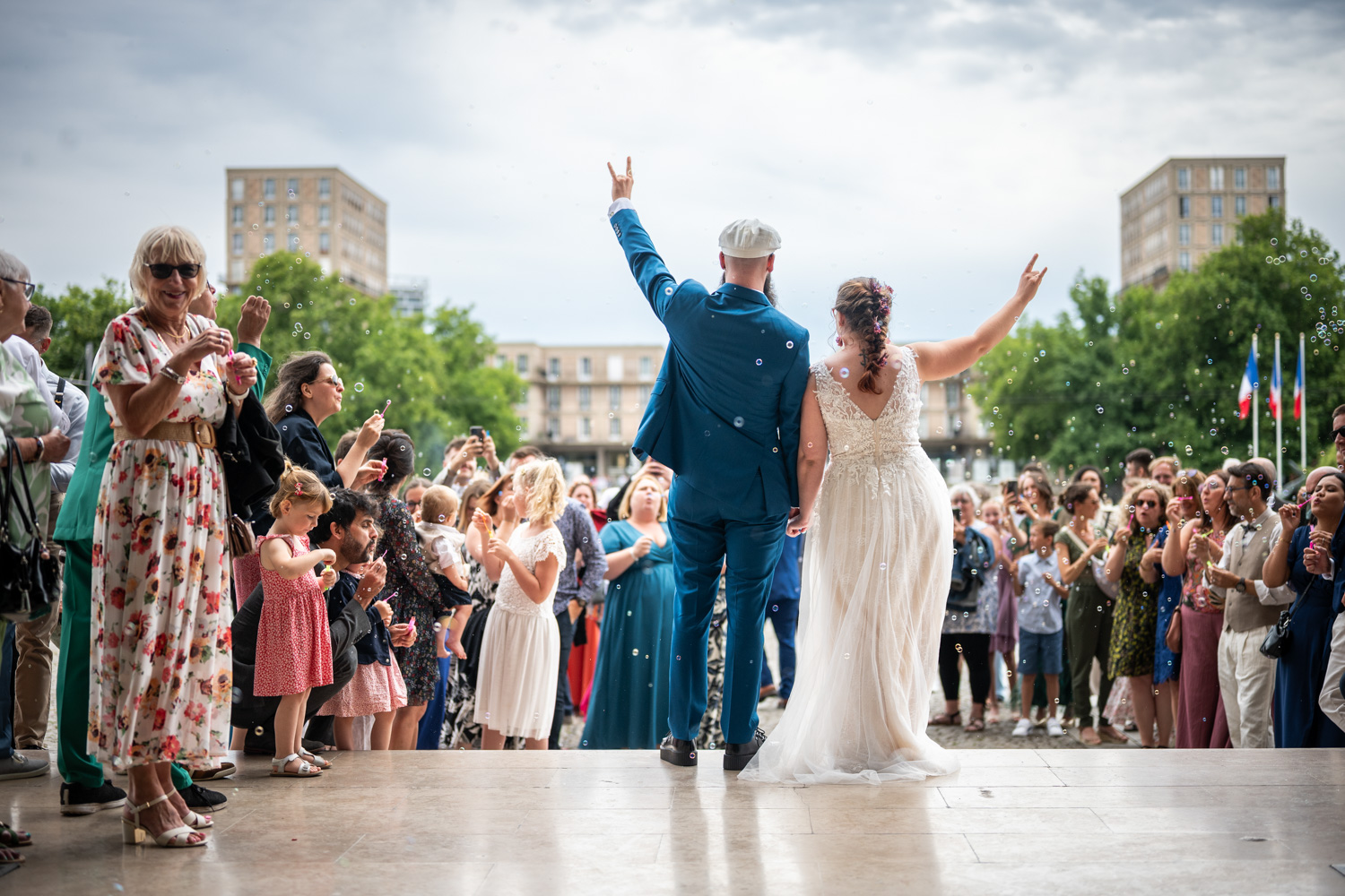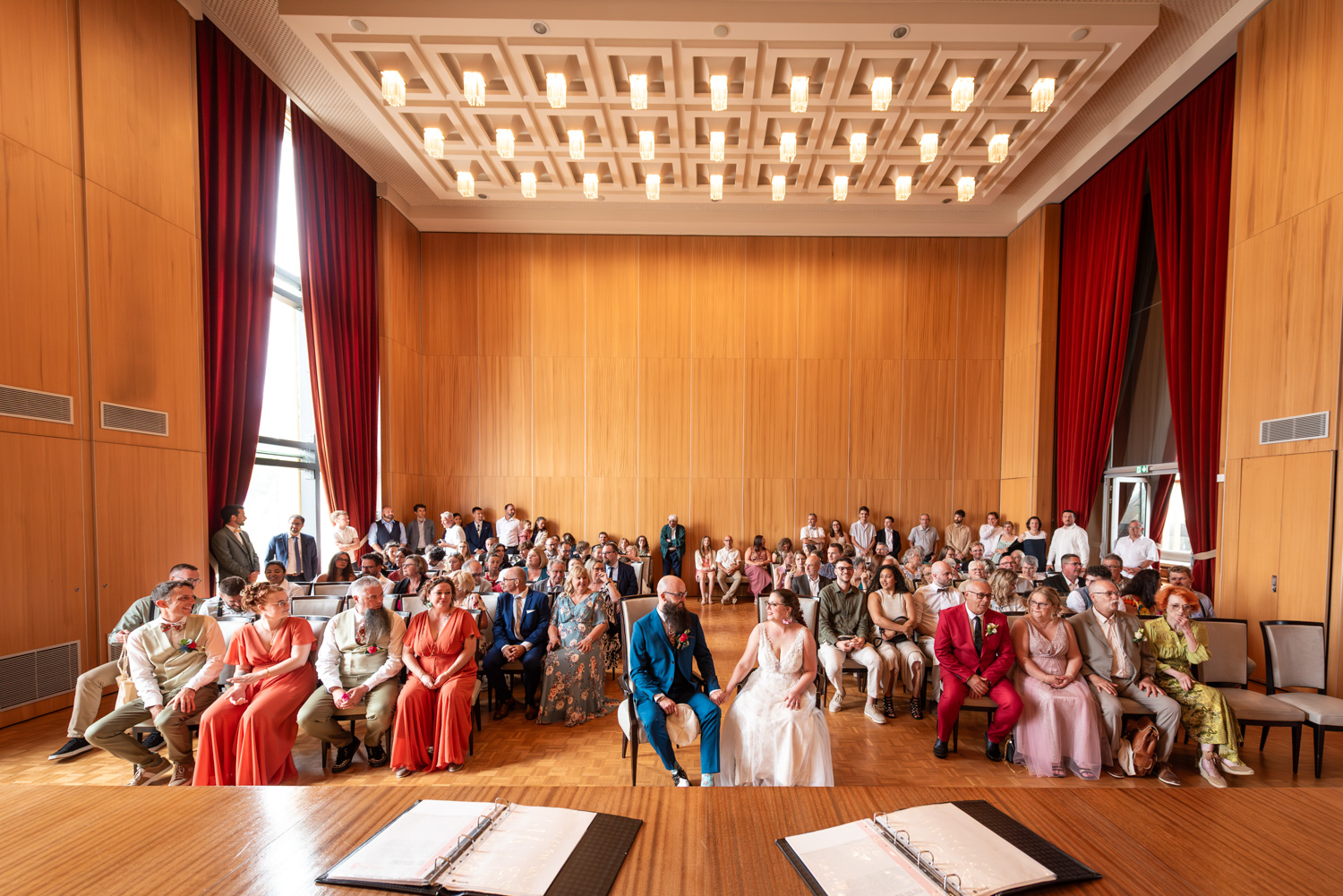 Le jour de leur mariage, ils se sont chacun préparés avec leurs témoins dans une ambiance chill et en musique évidemment ! Puis direction l’hôtel du ville du Havre pour se marier ! La suite de la journée s’est ensuite déroulée intégralement à la Ferme de Drumare pour y célébrer une cérémonie laïque touchante, une cocktail sous la pluie et un repas rythmé à grands coups de riffs de guitare saturés.