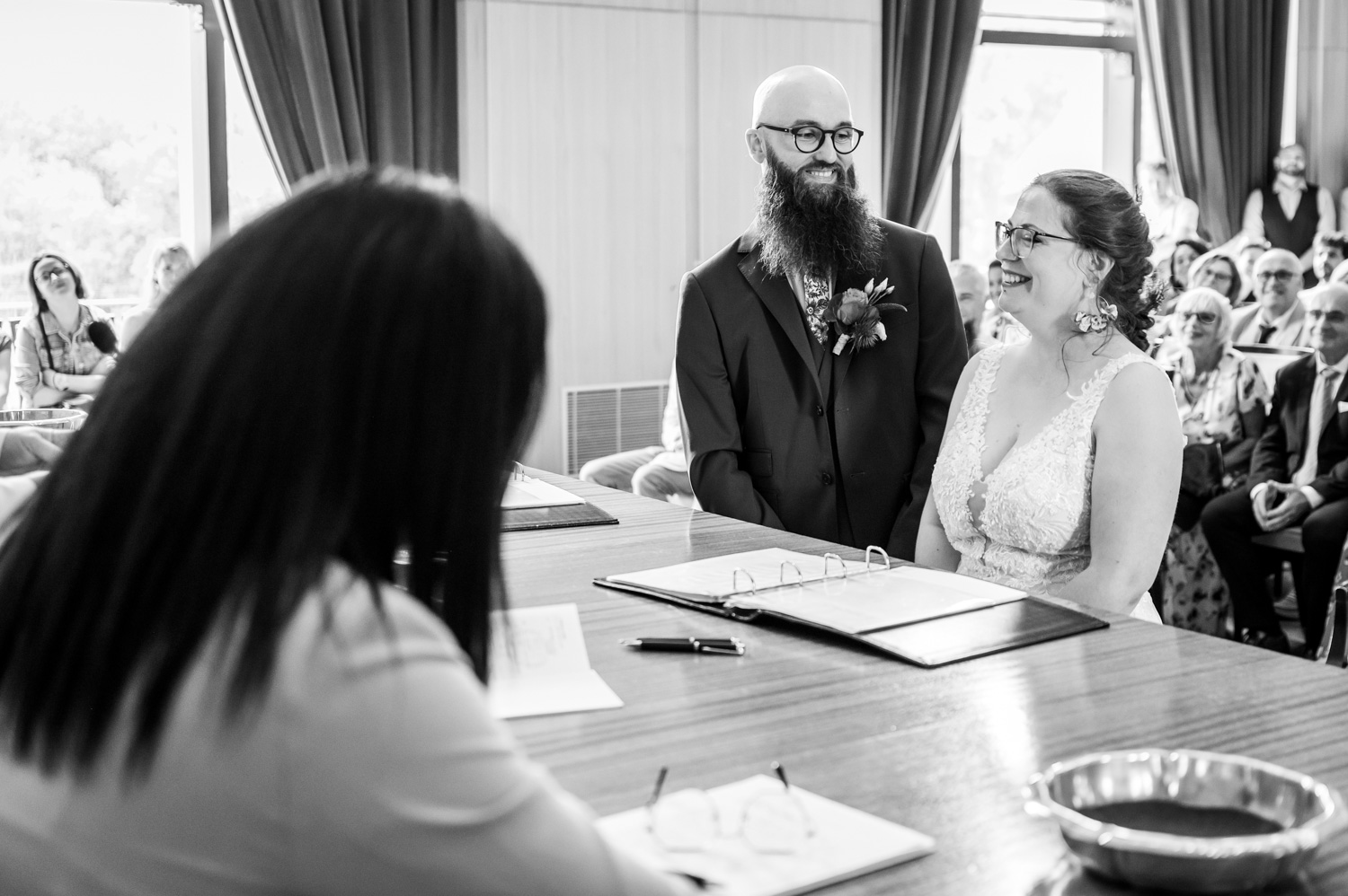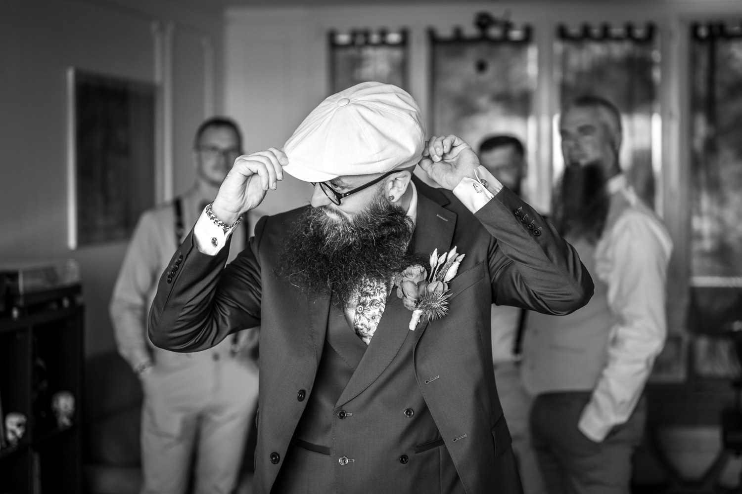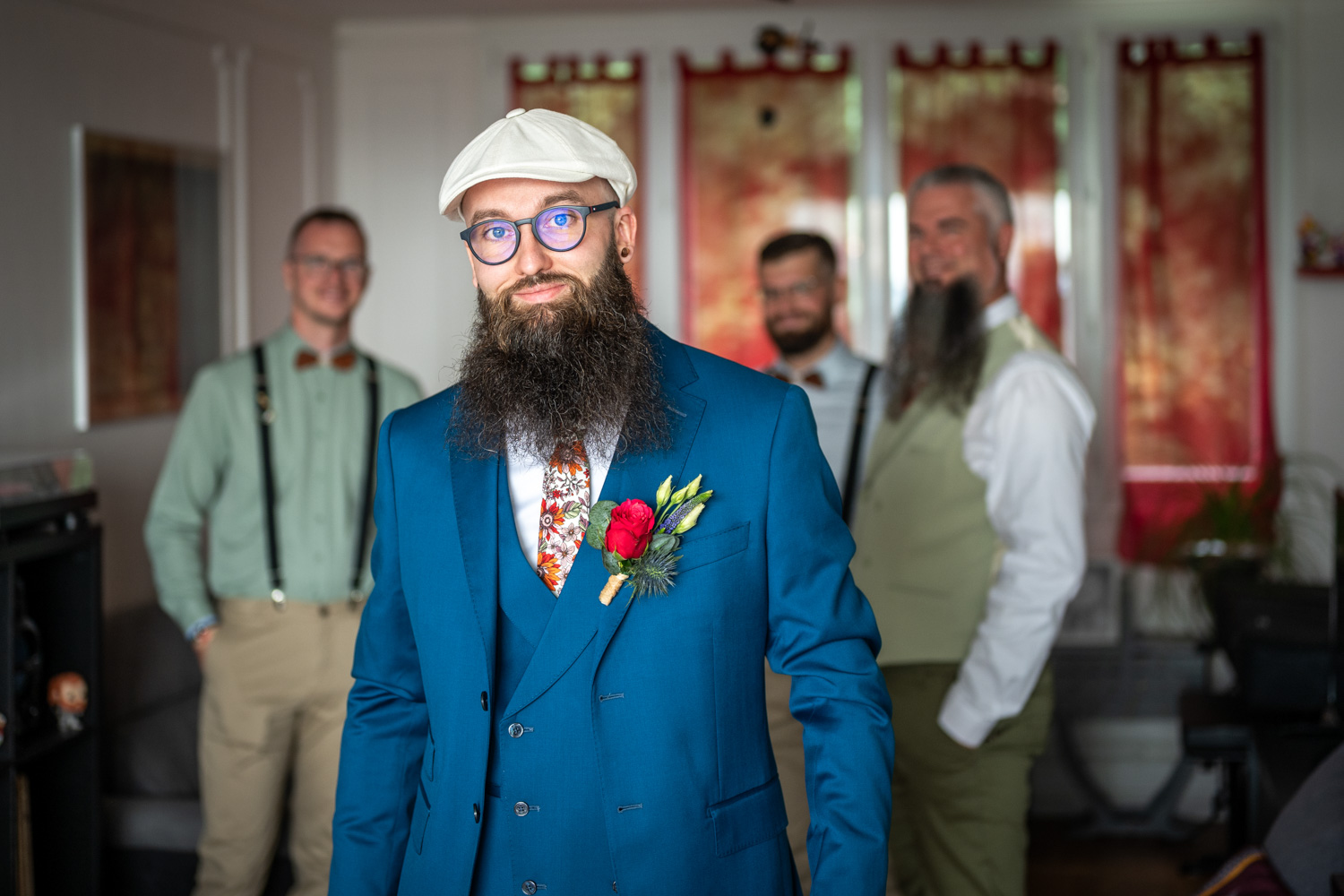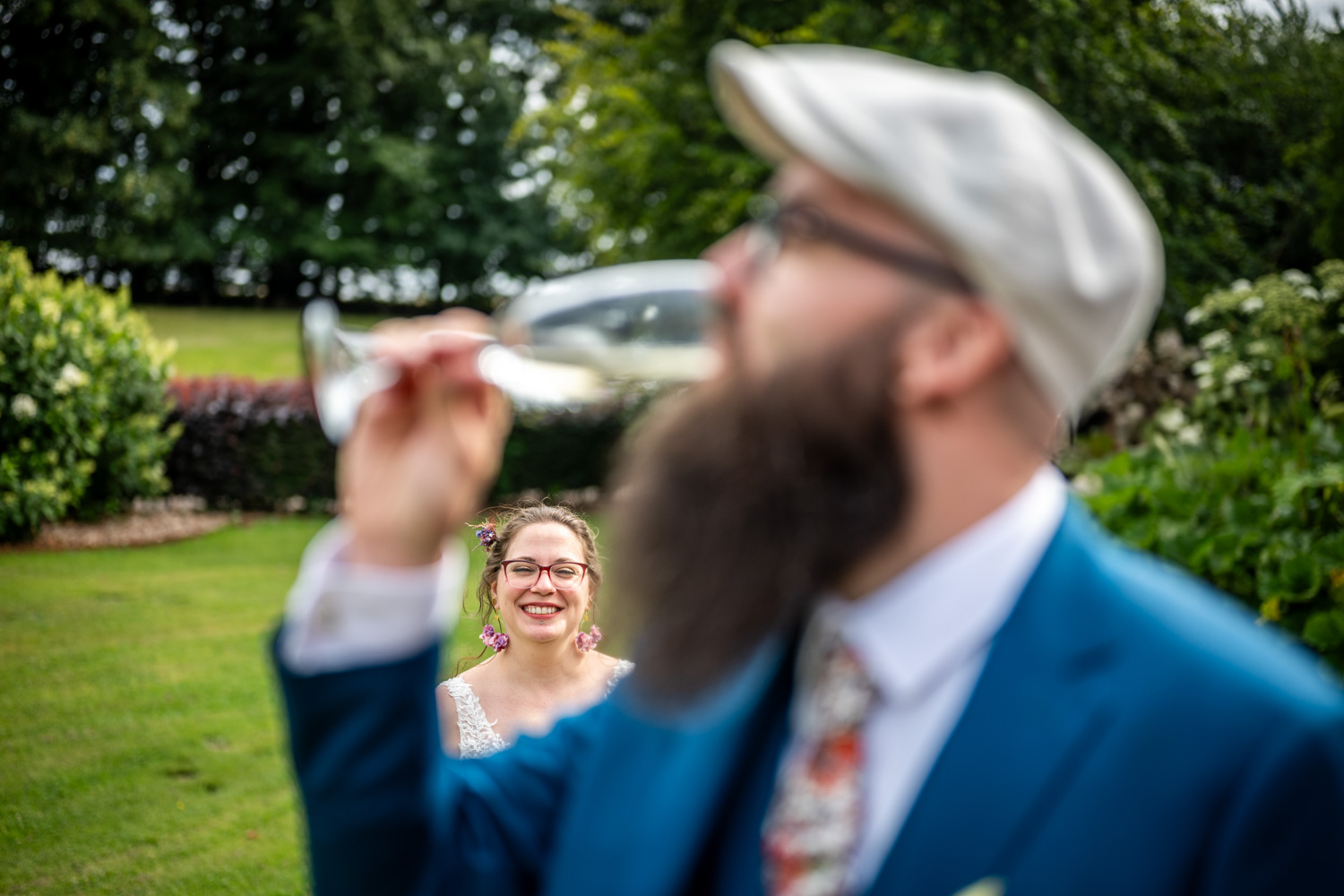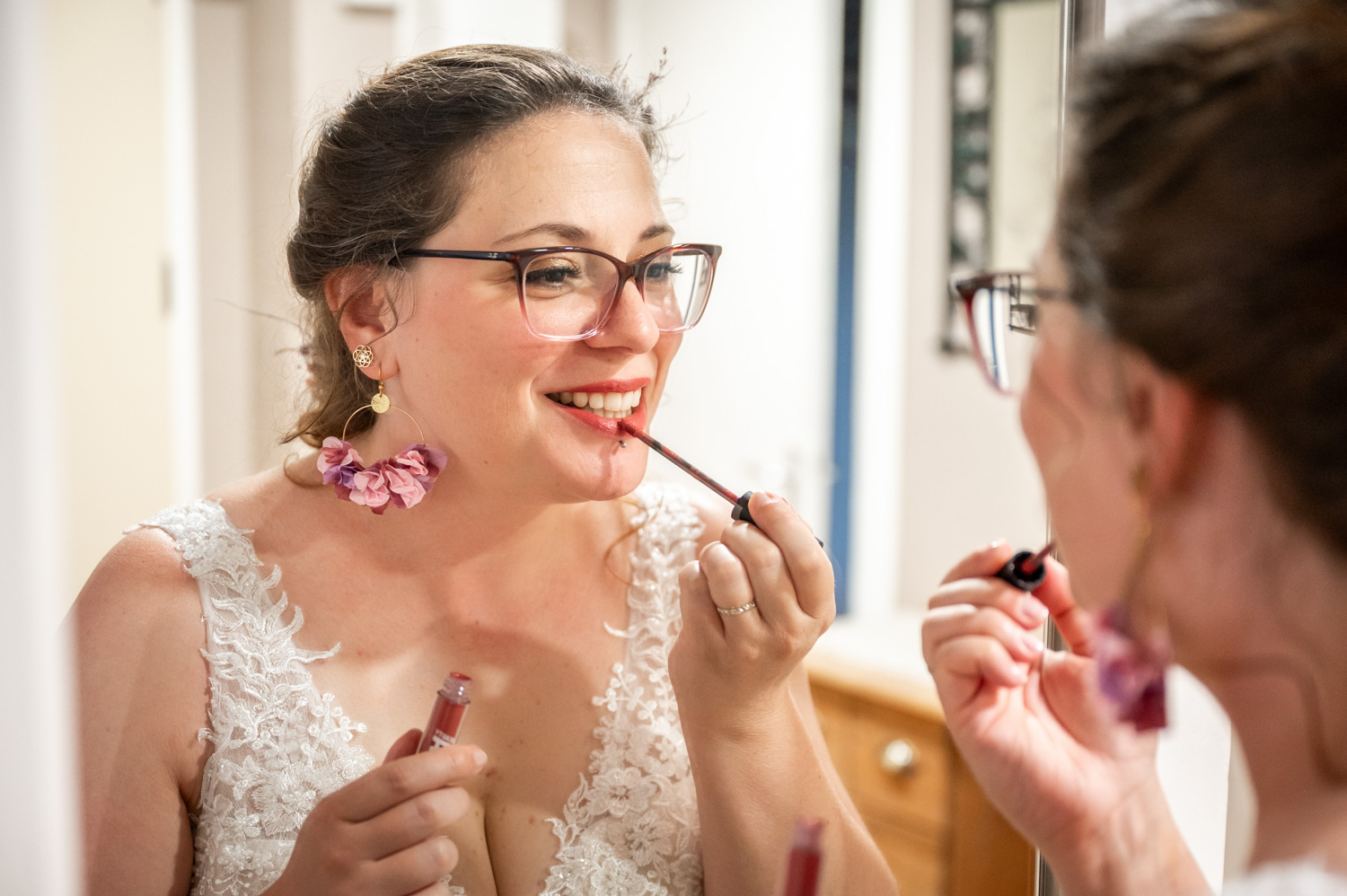 Le jour de leur mariage, ils se sont chacun préparés avec leurs témoins dans une ambiance chill et en musique évidemment ! Puis direction l’hôtel du ville du Havre pour se marier ! La suite de la journée s’est ensuite déroulée intégralement à la Ferme de Drumare pour y célébrer une cérémonie laïque touchante, une cocktail sous la pluie et un repas rythmé à grands coups de riffs de guitare saturés.
