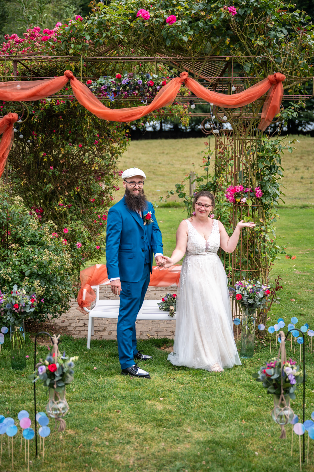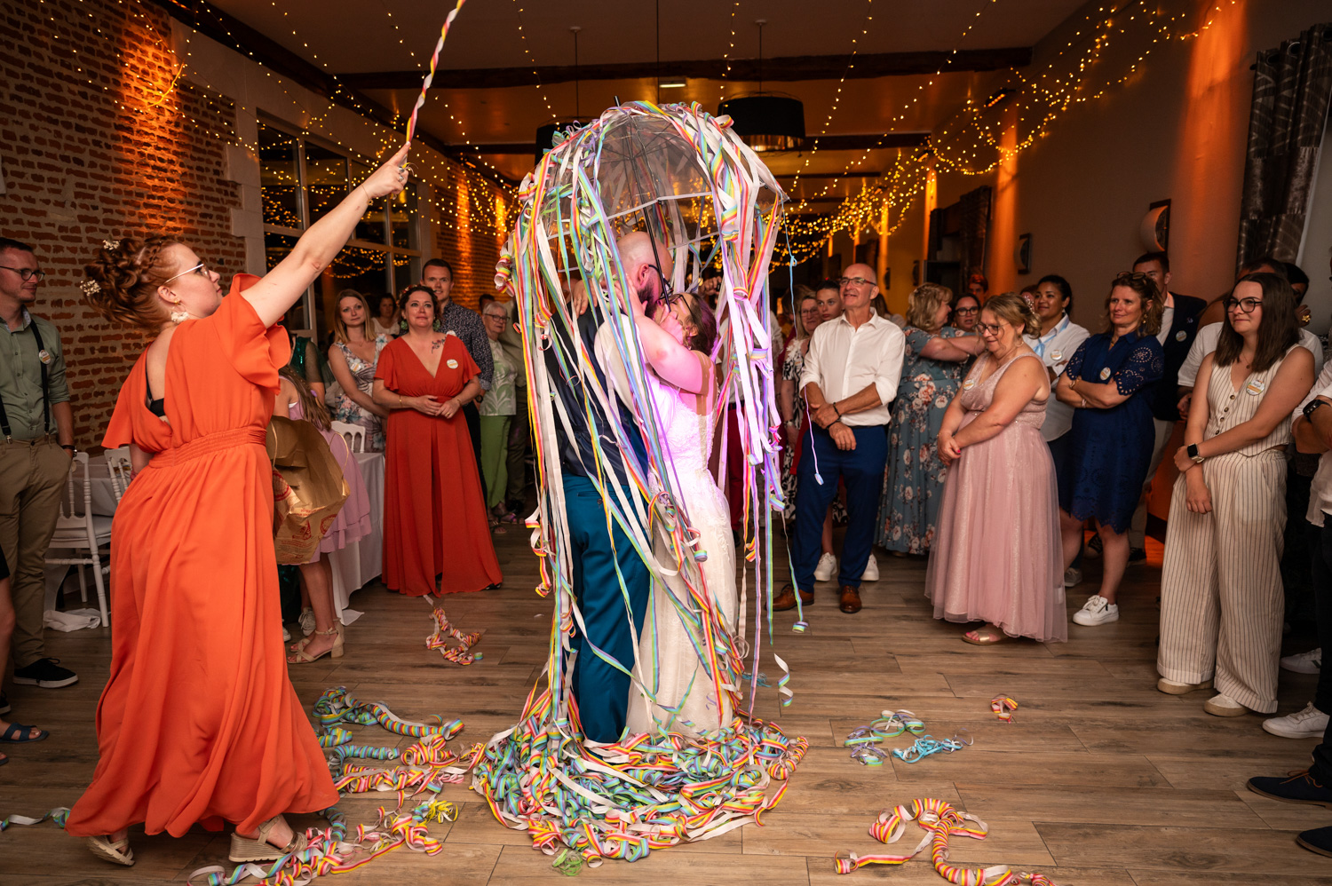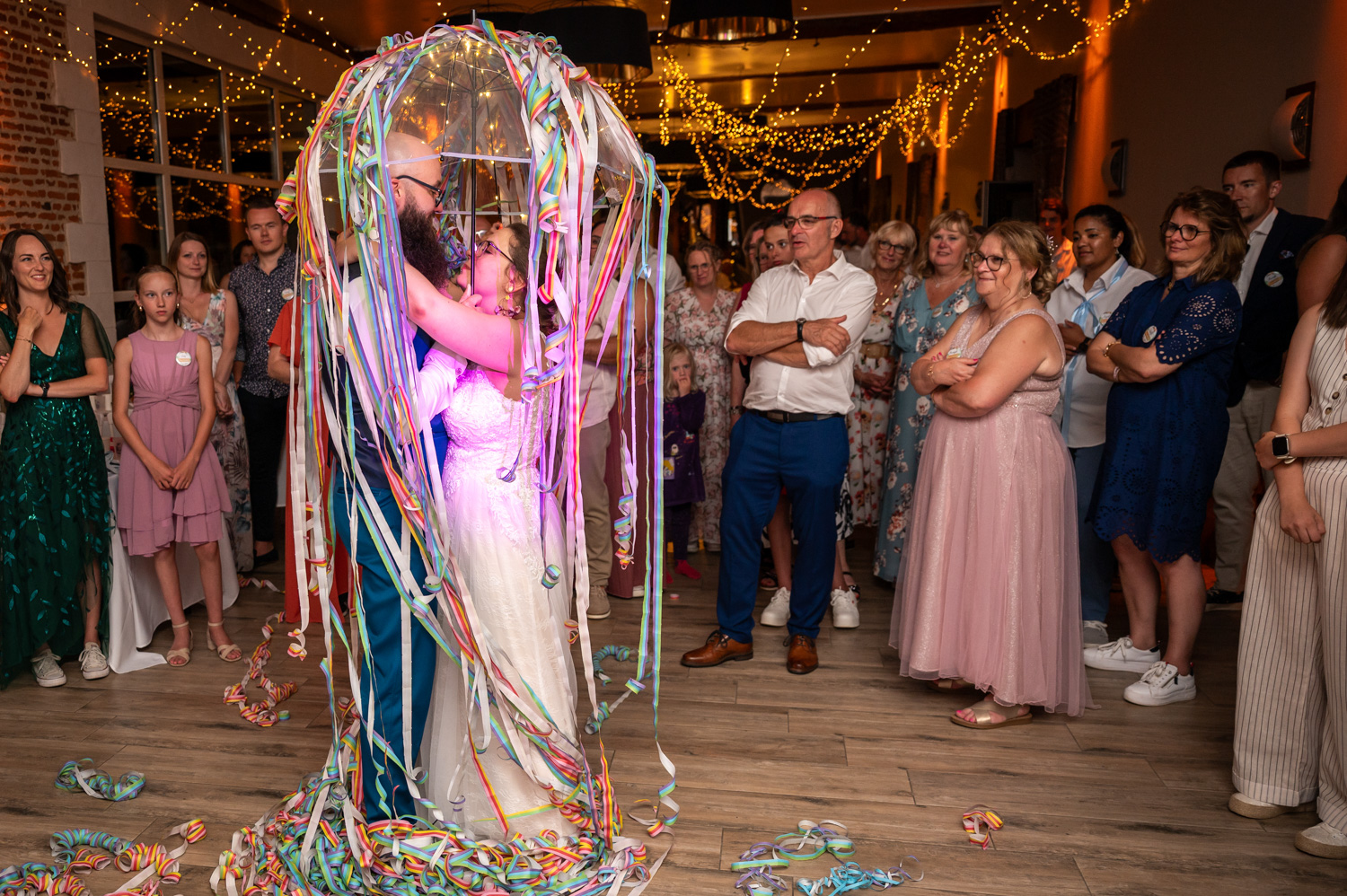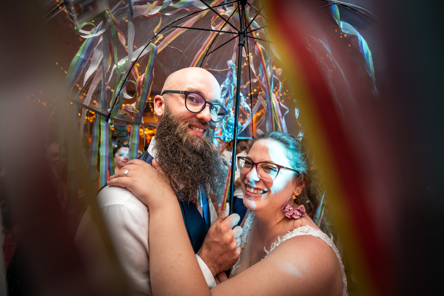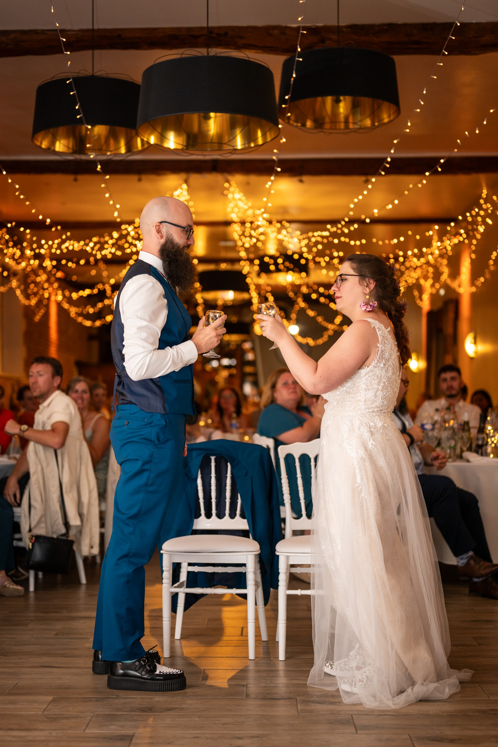 Il y a des clients avec qui tu fais un RDV autour d’un café, d’autres autour d’une bière, ou encore simplement en visio… Avec Marie et Lilian, on s’est rencontrés au Hellfest, dans la file du merch ! Vous vous doutez bien qu’a partir de là, il était évident qu’on était trrèèèès motivés à être leurs photographes de mariage. Lors qu’ils nous ont dit « Nous pour notre ouverture du bal on imagine bien faire une valse sur Machine Head. », nous nous sommes regardés en mode « Euuuh, pardon ? » l’histoire nous prouvera que c’est bel et bien possible 🙂