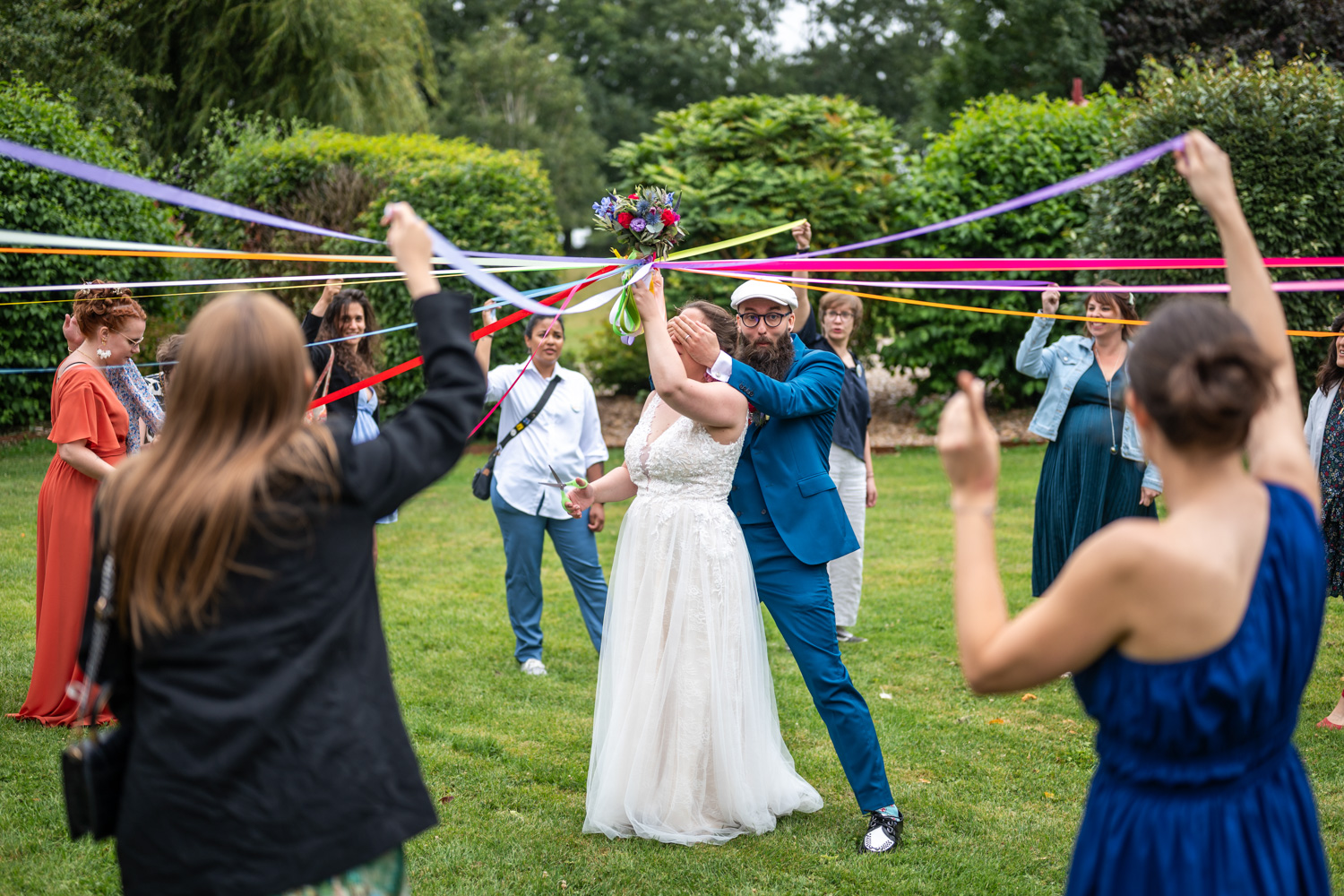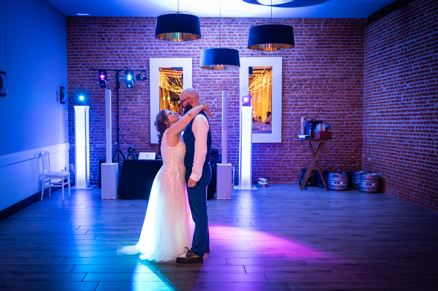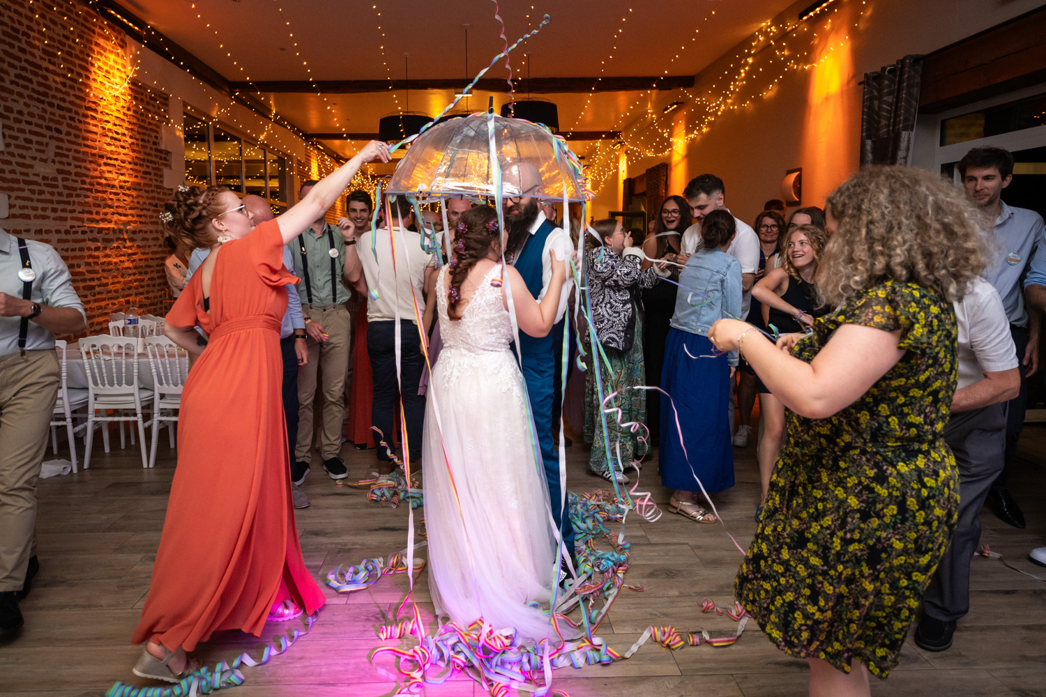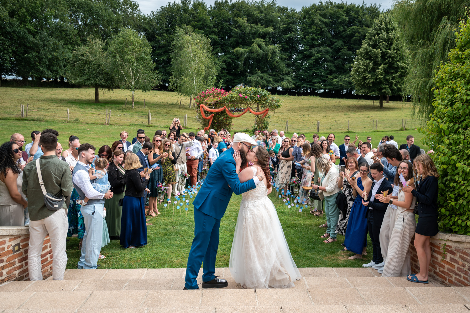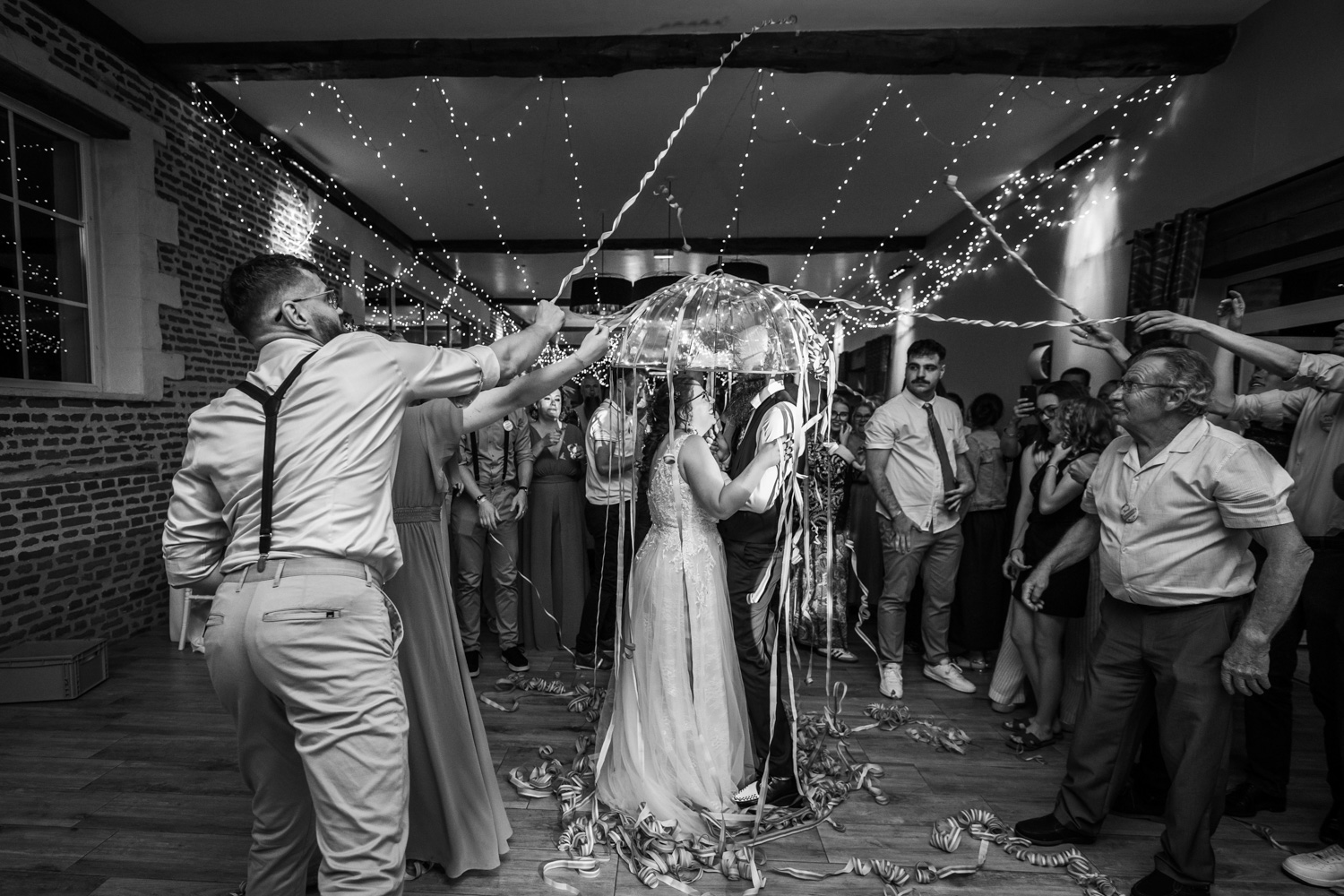 Il y a des clients avec qui tu fais un RDV autour d’un café, d’autres autour d’une bière, ou encore simplement en visio… Avec Marie et Lilian, on s’est rencontrés au Hellfest, dans la file du merch ! Vous vous doutez bien qu’a partir de là, il était évident qu’on était trrèèèès motivés à être leurs photographes de mariage. Lors qu’ils nous ont dit « Nous pour notre ouverture du bal on imagine bien faire une valse sur Machine Head. », nous nous sommes regardés en mode « Euuuh, pardon ? » l’histoire nous prouvera que c’est bel et bien possible 🙂