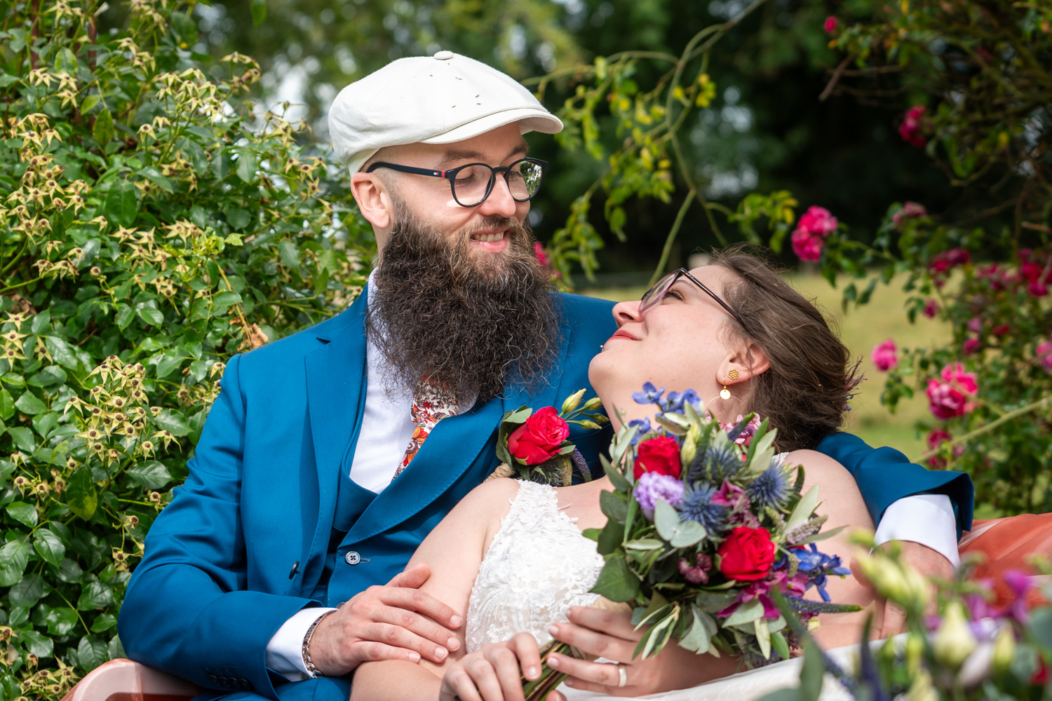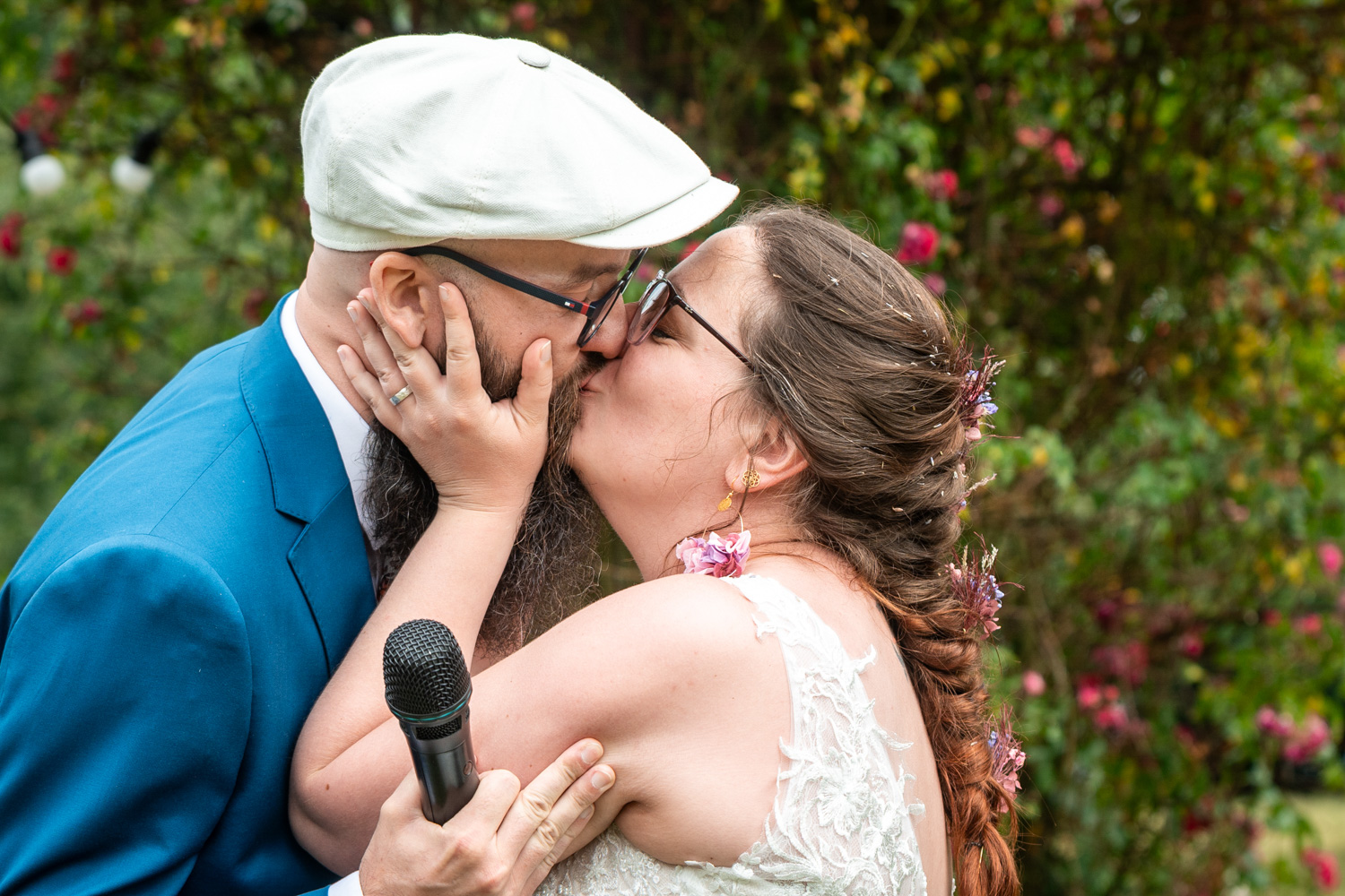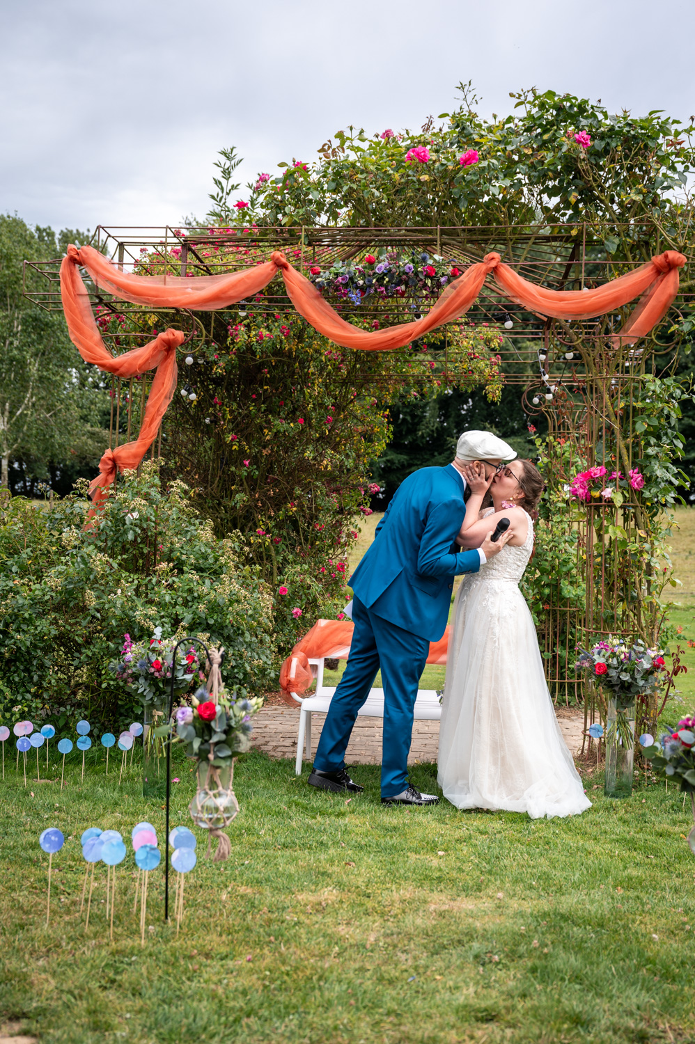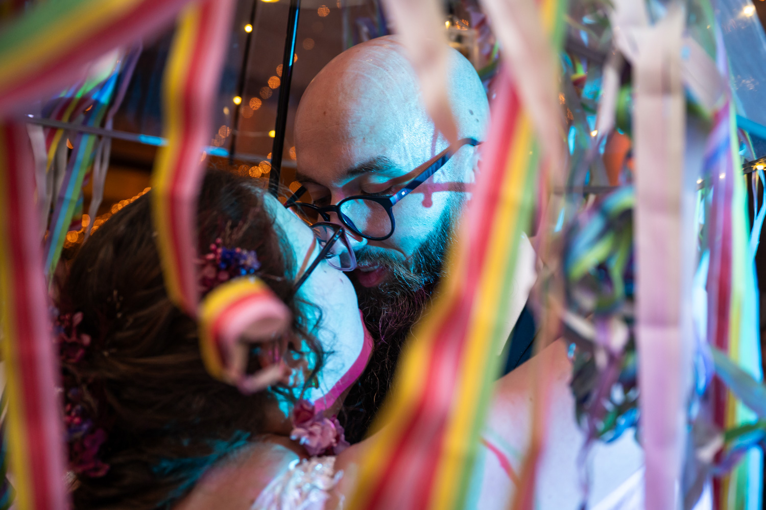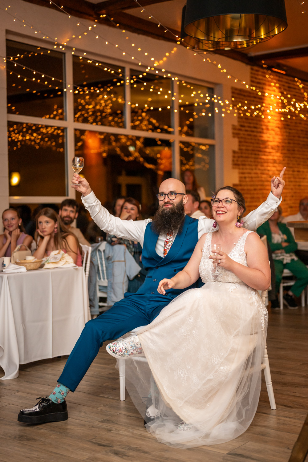 Il y a des clients avec qui tu fais un RDV autour d’un café, d’autres autour d’une bière, ou encore simplement en visio… Avec Marie et Lilian, on s’est rencontrés au Hellfest, dans la file du merch ! Vous vous doutez bien qu’a partir de là, il était évident qu’on était trrèèèès motivés à être leurs photographes de mariage. Lors qu’ils nous ont dit « Nous pour notre ouverture du bal on imagine bien faire une valse sur Machine Head. », nous nous sommes regardés en mode « Euuuh, pardon ? » l’histoire nous prouvera que c’est bel et bien possible 🙂